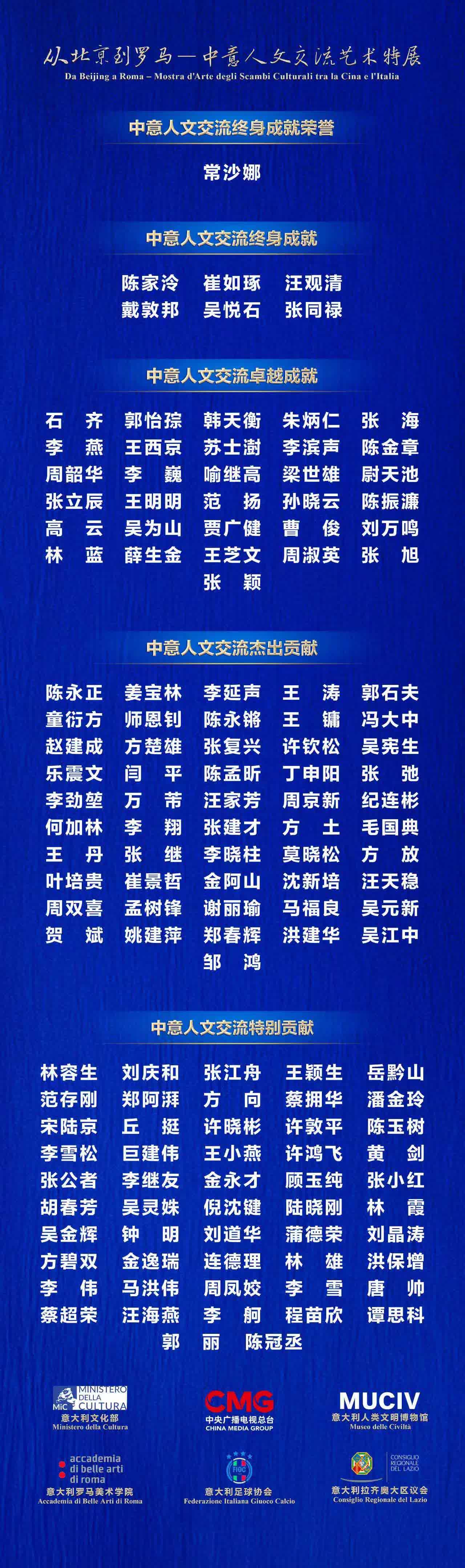 10月24日,「從北京到羅馬」——中意人文交流系列榮譽頒授活動在京舉行,141位藝術家分獲「終身成就」「卓越成就」「傑出貢獻」和「特別貢獻」等榮譽。中宣部副部長、中央廣播電視總台台長慎海雄,國家體育總局副局長、黨組成員佟立新,廣東省委常委、宣傳部部長胡勁軍,全國政協副秘書長、民盟中央專職副主席、中國美術家協會副主席吳為山以及意大利駐華大使館官員、藝術家代表出席活動。國際奧委會主席考文垂視頻致辭。