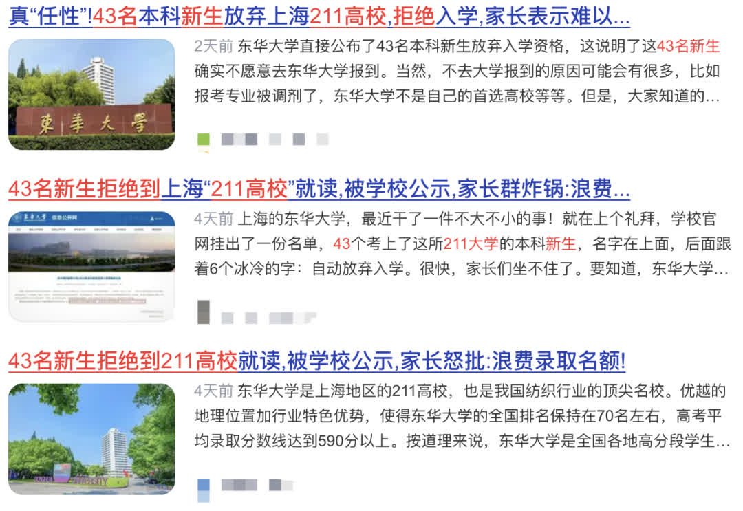 還有自媒體以「43名新生拒絕到211高校就讀」為題,在網上轉發公告並指責相關學生「任性」。