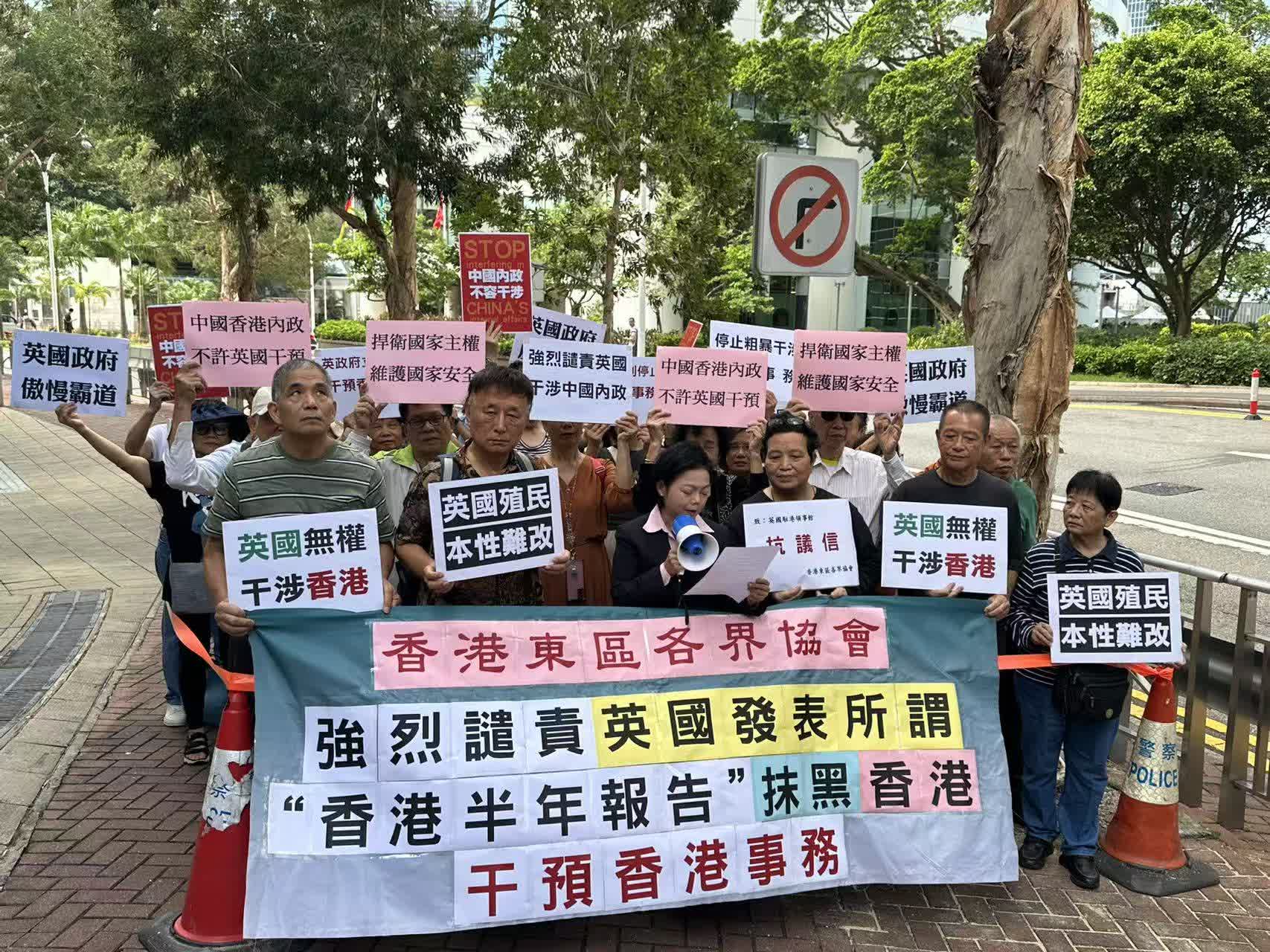 英國24日發表所謂「香港問題半年報告」,對香港特區各方面情況作出失實言論和污衊抹黑。多批香港市民今日(25日)先後到英國駐香港總領事館抗議,批評英方以所謂「報告」對香港事務說長道短,抹黑香港國安法和人權法治,公然干涉中國內政,嚴重違背國際法基本準則,是對中國主權的粗暴踐踏。