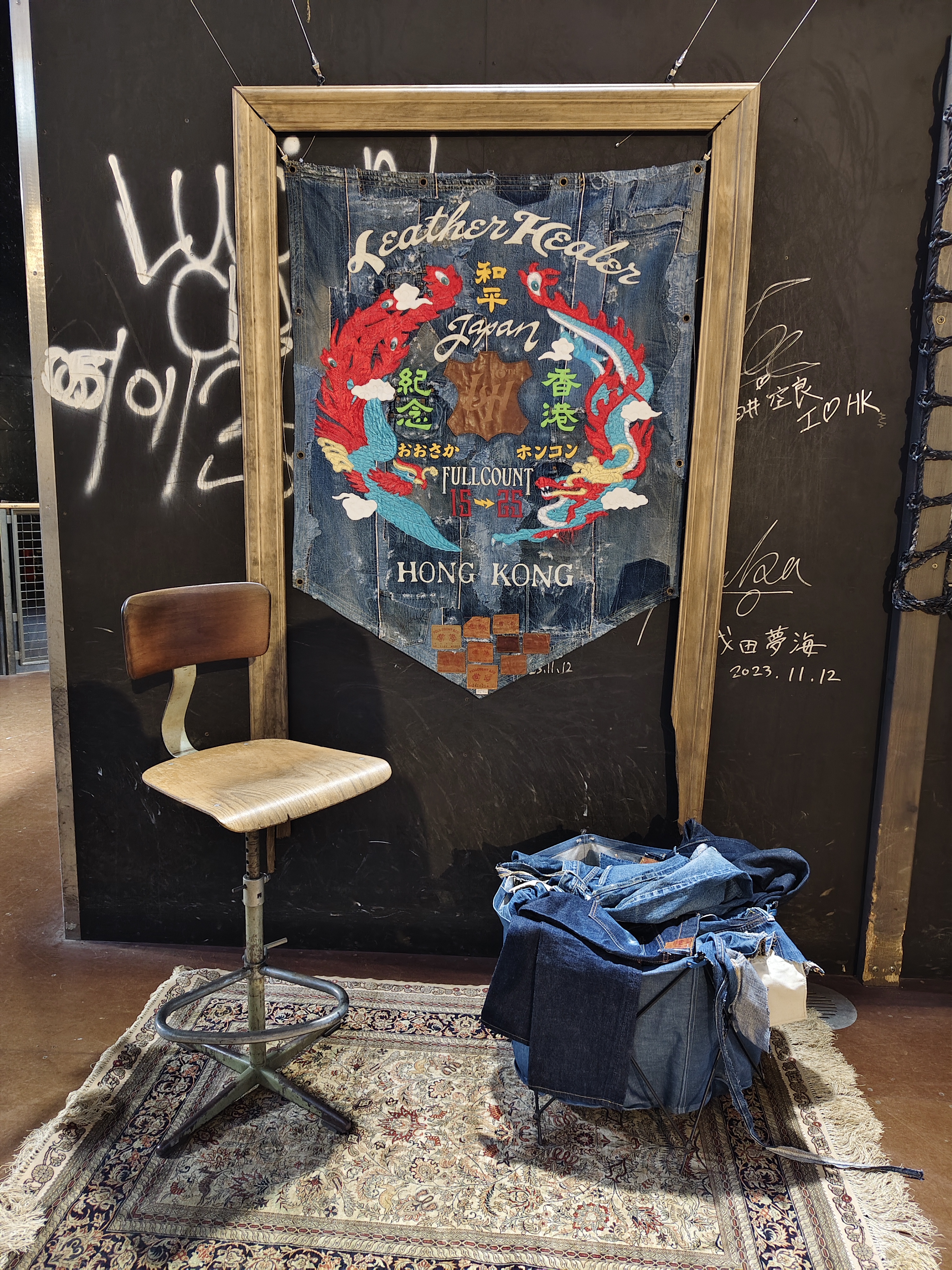 還有,香港時裝設計師兼布藝改造達人林偉強也展出FULLCOUNT牛仔褲改造系列,巨型旗幟設計源自LEATHER HEALER聯乘FULLCOUNT十周年紀念圖案,林偉強以中古FULLCOUNT牛仔褲配搭中式舊布料,透過拼布與舊化處理,展現香港與日本風格融合的工藝美學;另有以古着再造概念製成的升級再造牛仔褲。