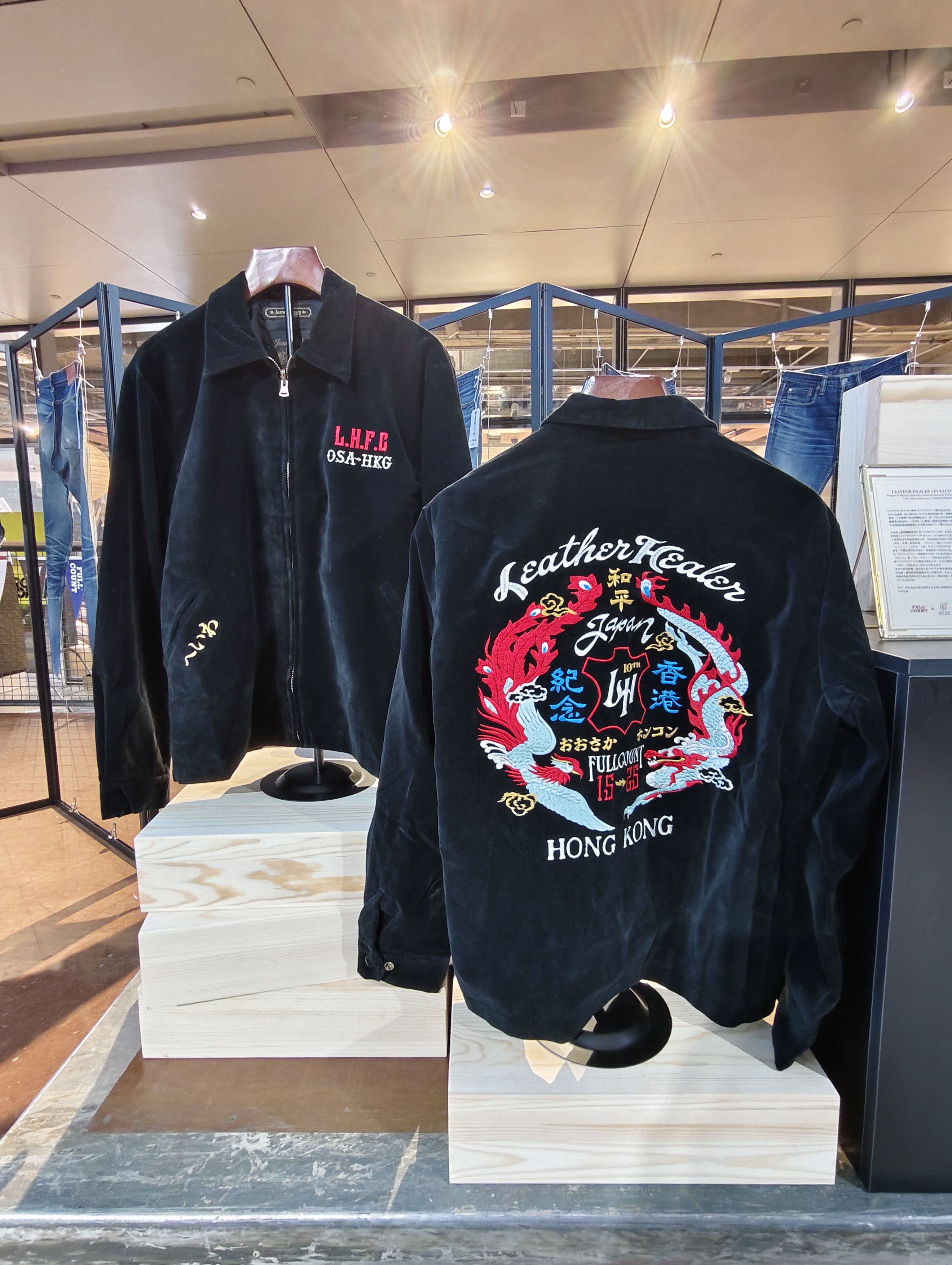 其中,LEATHER HEALER聯乘FULLCOUNT十周年紀念外套,以經典Souvenir Jacket為基礎,配上復刻自1950年代風格的襯衫領,刺繡是Souvenir Jacket的靈魂,今次聯乘外套的刺繡取材自一枚70至80年代的香港紀念碟圖案,而刺繡圖案由擁有約七十年歷史、以精湛工藝聞名的傳統大阪刺繡廠製作,結合中式傳統的龍鳳圖案與日本元素而成的LH十周年紀念外套。
