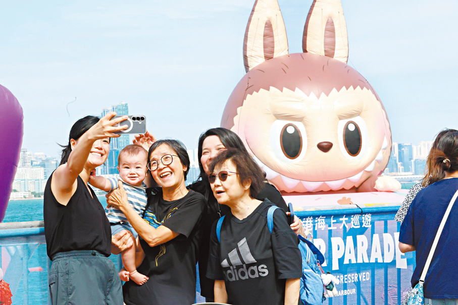 四座巨型充氣雕塑昨日在維港中央一字排開,在藍天與城市天際線的映襯下,形成壯麗的「維港艦隊」,現場聚集眾多市民與旅客,專為巨型IP充氣雕塑而來,他們紛紛舉起手機捕捉這個壯觀的場面,而當中多啦A夢與LABUBU兩大IP角色人氣最盛,不少人也在這兩個巨型充氣雕塑前拍照留念。