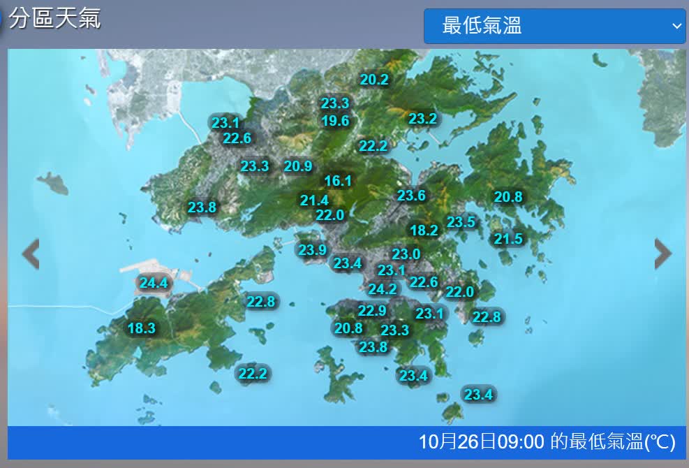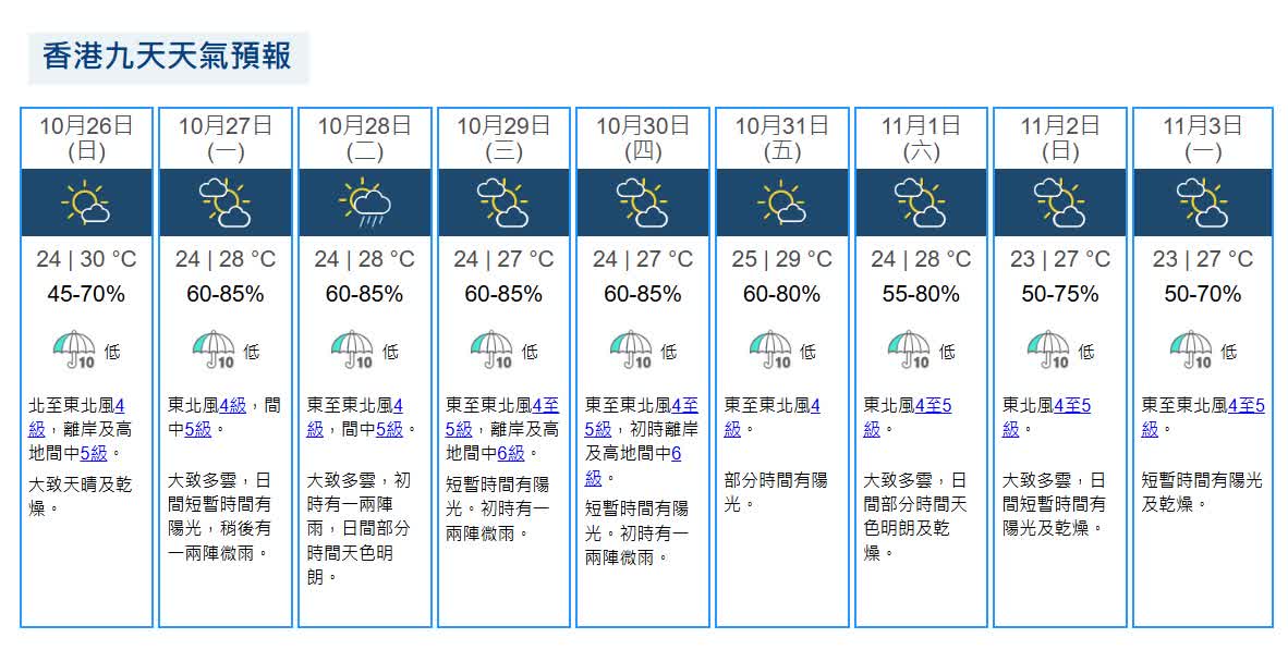 展望本港未來一兩日大致多雲,重陽節及星期四風勢頗大。27日(星期一)大致多雲,日間短暫時間有陽光,稍後有一兩陣微雨,氣溫介乎24至28度。26日(星期二)天氣大致多雲,初時有一兩陣雨,日間部分時間天色明朗,氣溫介24至28度。29日(星期三,重陽節)天氣短暫時間有陽光,初時有一兩陣微雨。