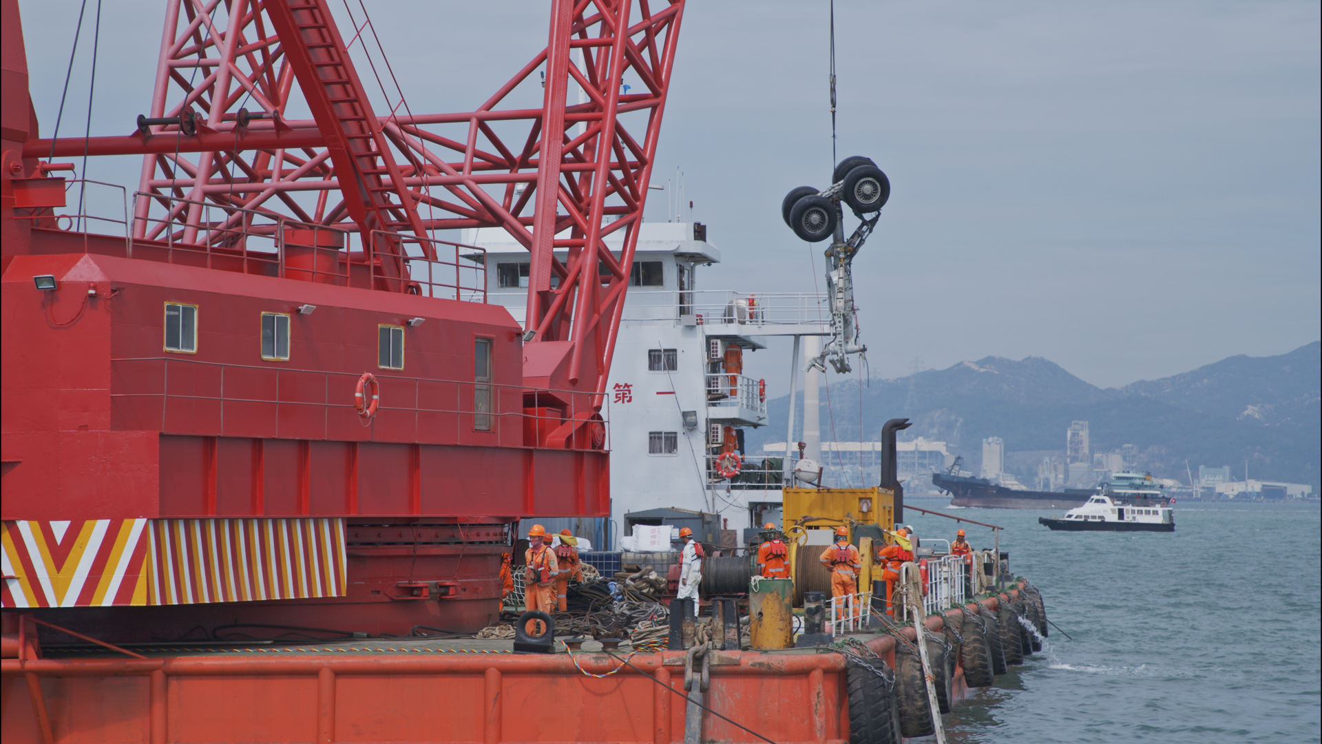 今日早上約9時,打撈團隊的專業打撈船「南天翔」、「南天鵬」及拖船「穗救拖18」,再吊起貨機的部分機身殘骸放在躉船上。隨後工程人員小心用鋼索從四邊固定擱在跑道對出防波堤海中最大的一件殘骸,即貨機的機身連機頭部分。至下午約1時半開始,打撈船的吊機逐步緩慢的將整件殘骸吊起,可見左邊機翼逐漸離開水面。屬廣州打撈局的另一艘拖船「德鵬」,以及用作承載超大物件的半潛船「重任1500」亦遂步移近北跑道。