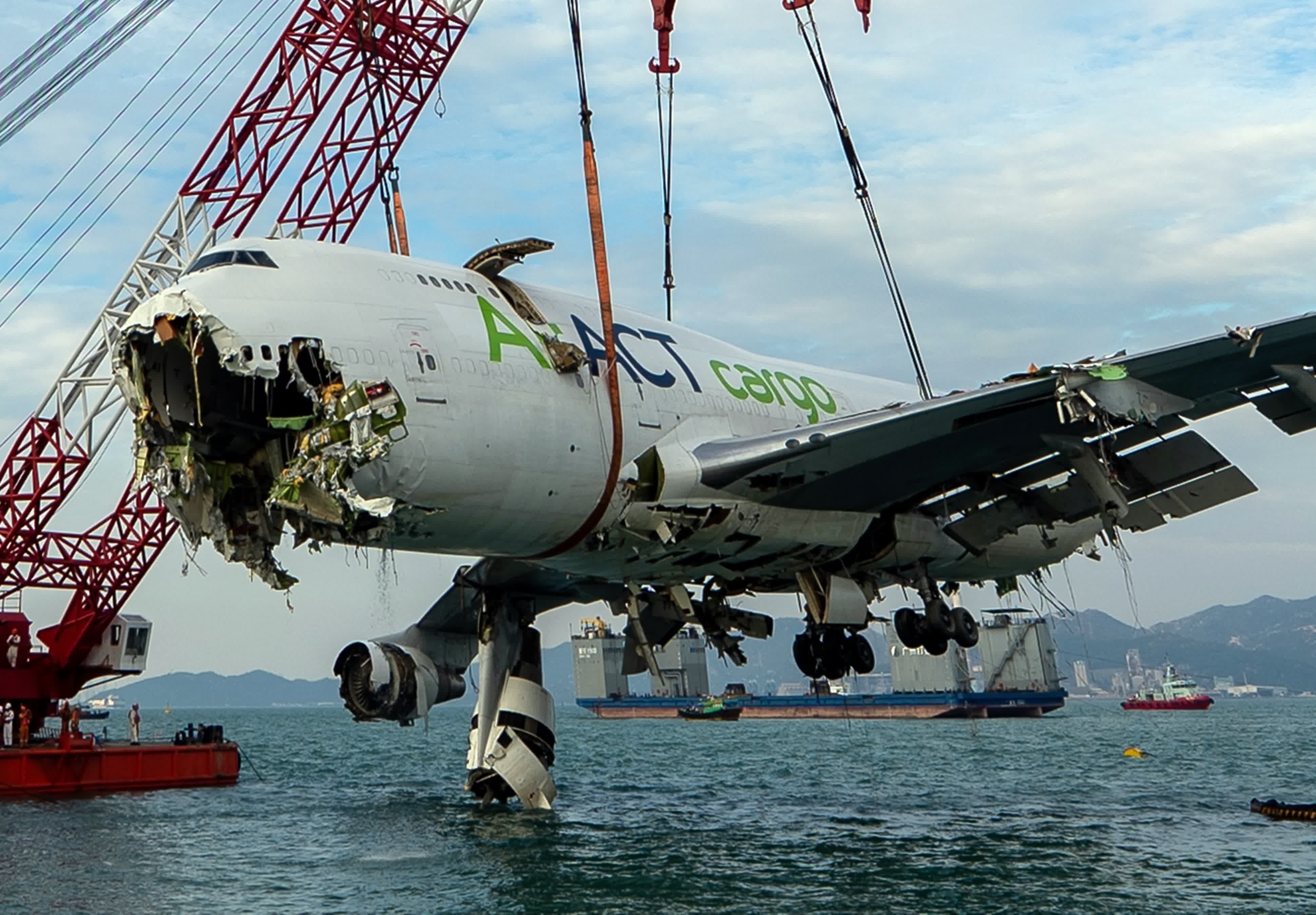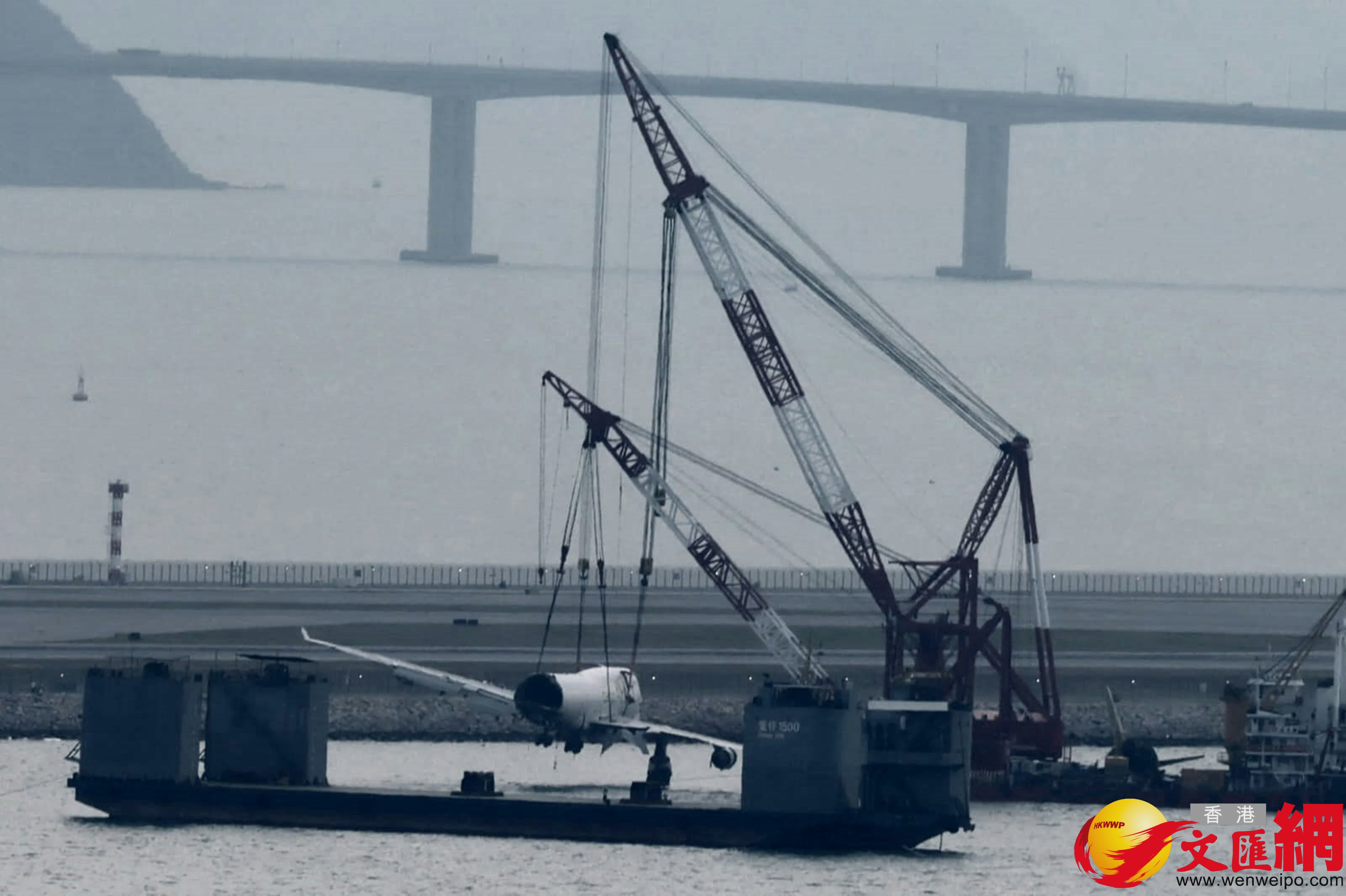 今日早上約9時,打撈團隊的打撈船「南天翔」、「南天鵬」及拖船「穗救拖18」,再吊起貨機的部分機身殘骸放在躉船上。隨後工程人員小心用鋼索從四邊固定擱在跑道對出防波堤海中的最大一件殘骸,即貨機的機身連機頭部分。