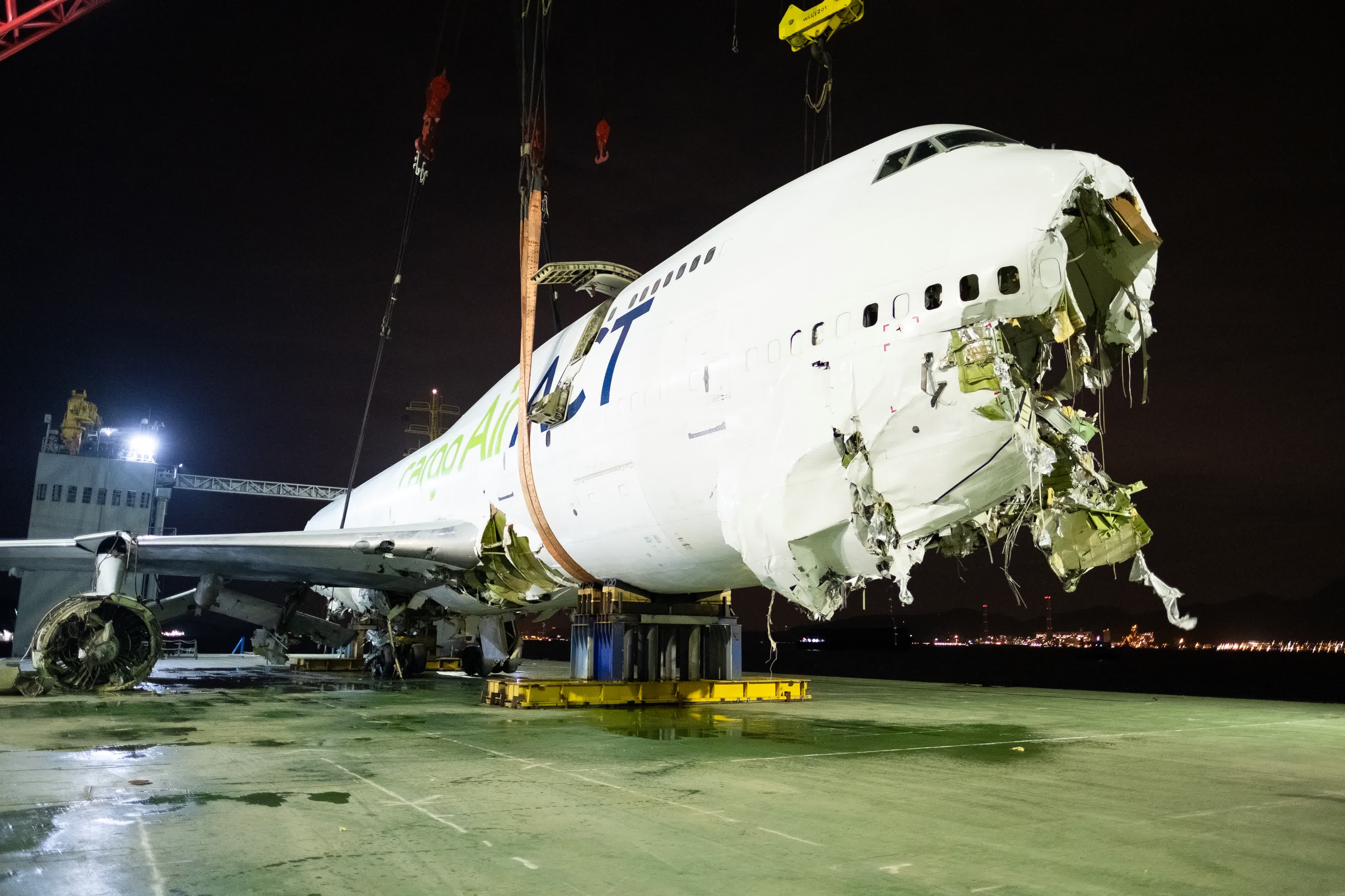吊運期間可見貨機的機翼和機身底部均損毀嚴重,機肚露出起落架,但機頭位置的起落架脫落致半個機頭失去;另外左邊機翼的兩個引擎脫落,右邊機翼的兩個引擎亦嚴重毀爛,其中一個更加半天吊。