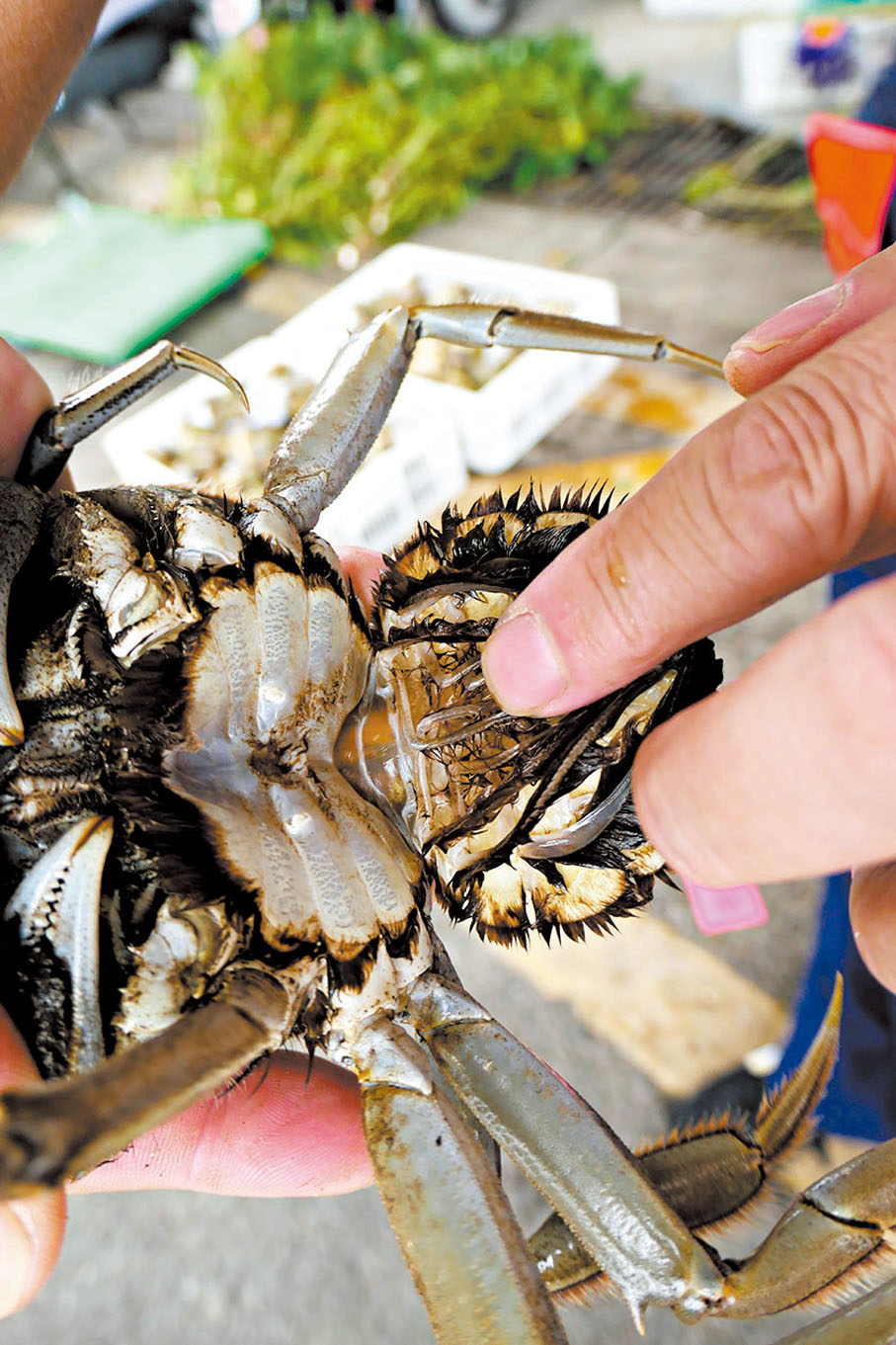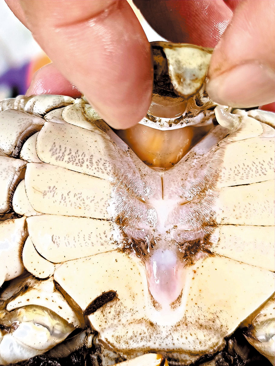 【察腹部】母蟹重點看屁股,屁股飽滿則蟹黃較多;公蟹重點看蟹嘴,蟹嘴發紅已成熟,發白則未成熟。