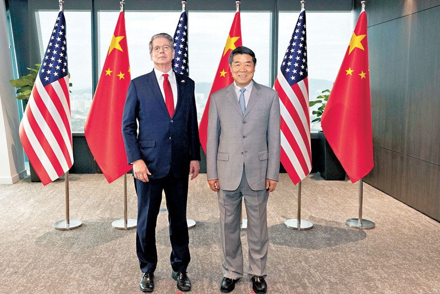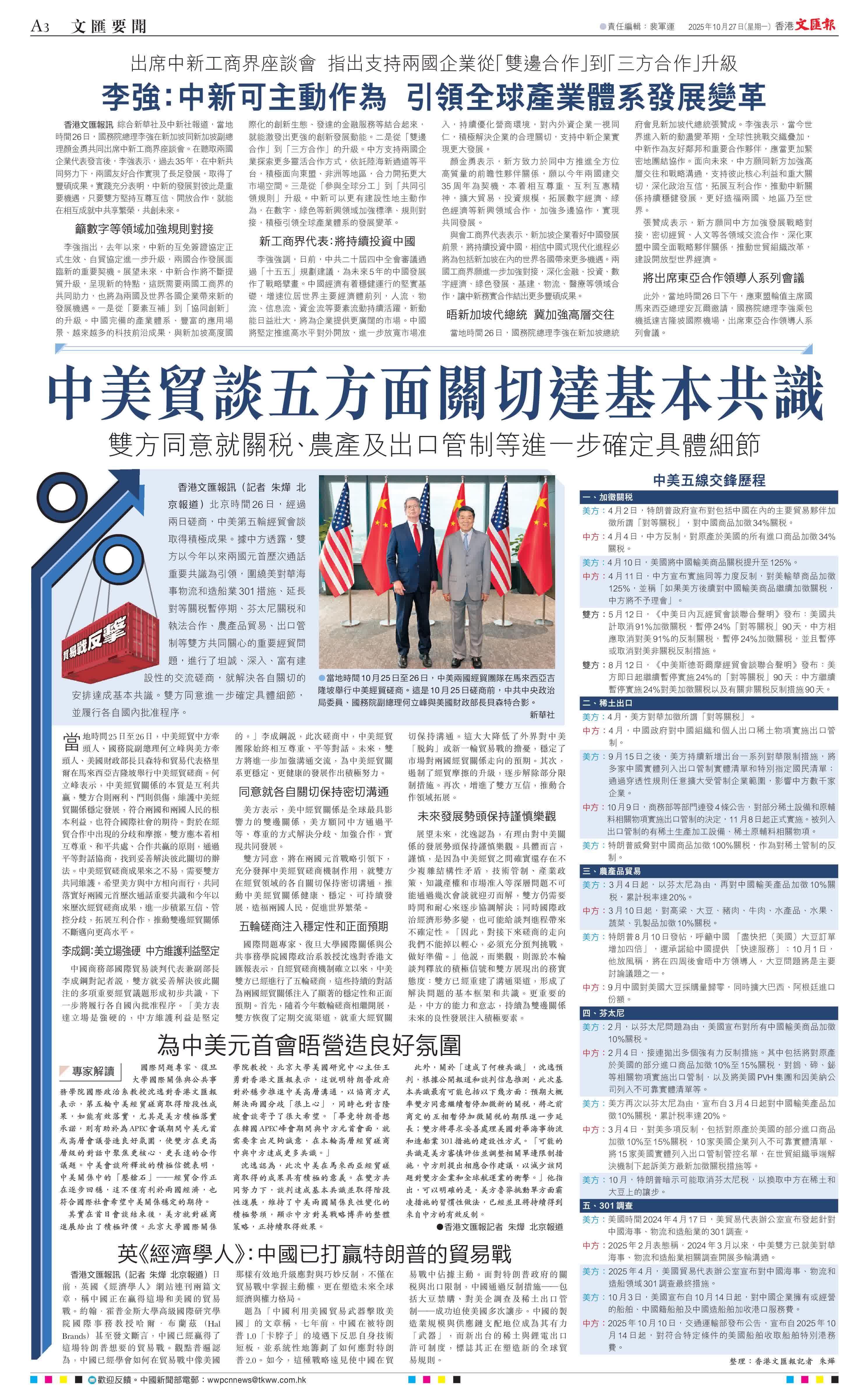 (香港文匯報記者朱燁 北京報道)北京時間26日,經過兩日磋商,中美第五輪經貿會談取得積極成果。據中方透露,雙方以今年以來兩國元首歷次通話重要共識為引領,圍繞美對華海事物流和造船業301措施、延長對等關稅暫停期、芬太尼關稅和執法合作、農產品貿易、出口管制等雙方共同關心的重要經貿問題,進行了坦誠、深入、富有建設性的交流磋商,就解決各自關切的安排達成基本共識。雙方同意進一步確定具體細節,並履行各自國內批准程序。