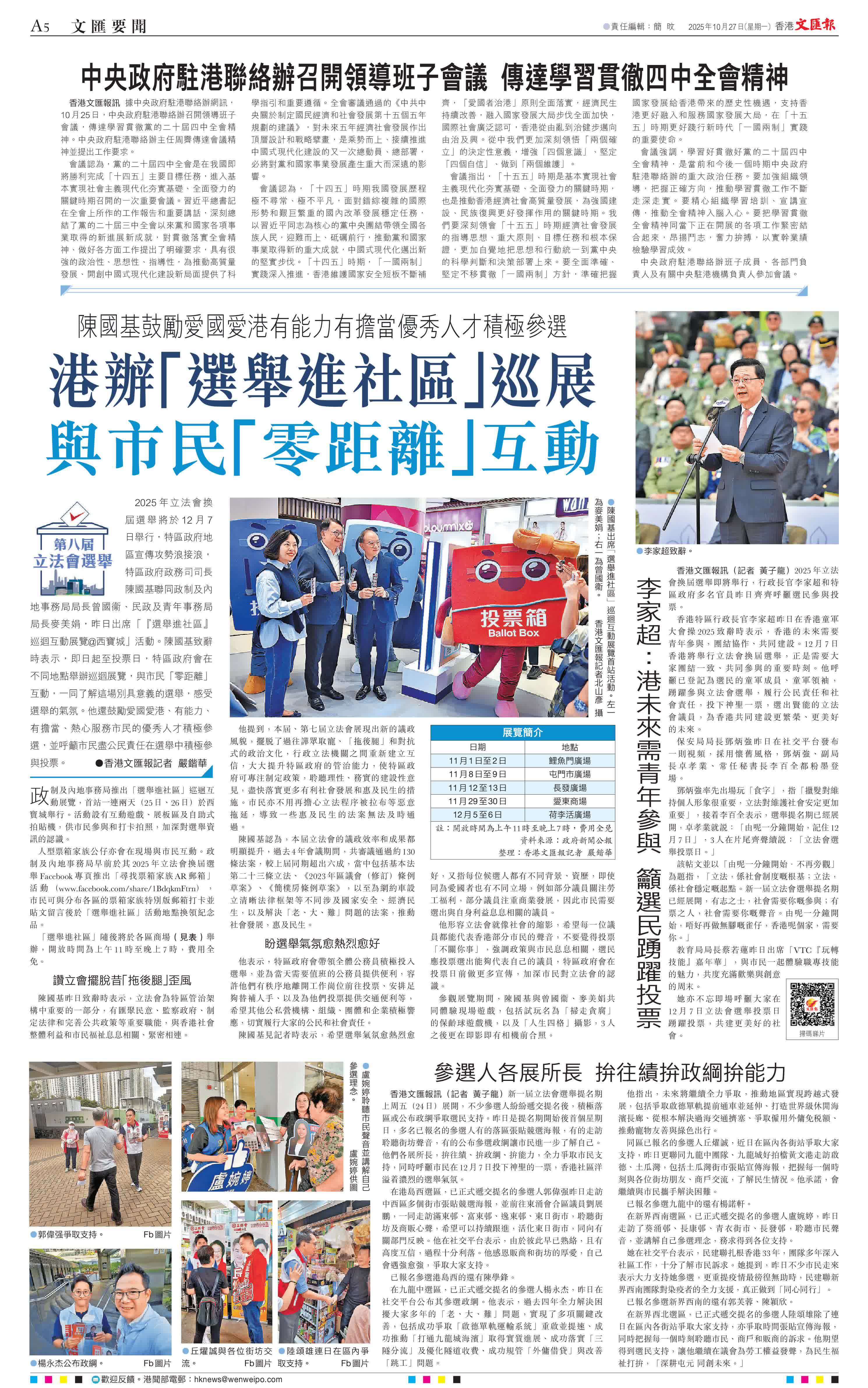 (香港文匯報記者 嚴鍇華)2025年立法會換屆選舉將於12月7日舉行,特區政府地區宣傳攻勢浪接浪,特區政府政務司司長陳國基聯同政制及內地事務局局長曾國衞、民政及青年事務局局長麥美娟,昨日出席「『選舉進社區』巡迴互動展覽@西寶城」活動。陳國基致辭時表示,即日起至投票日,特區政府會在不同地點舉辦巡迴展覽,與市民「零距離」互動,一同了解這場別具意義的選舉,感受選舉的氣氛。他還鼓勵愛國愛港、有能力、有擔當、熱心服務市民的優秀人才積極參選,並呼籲市民盡公民責任在選舉中積極參與投票。