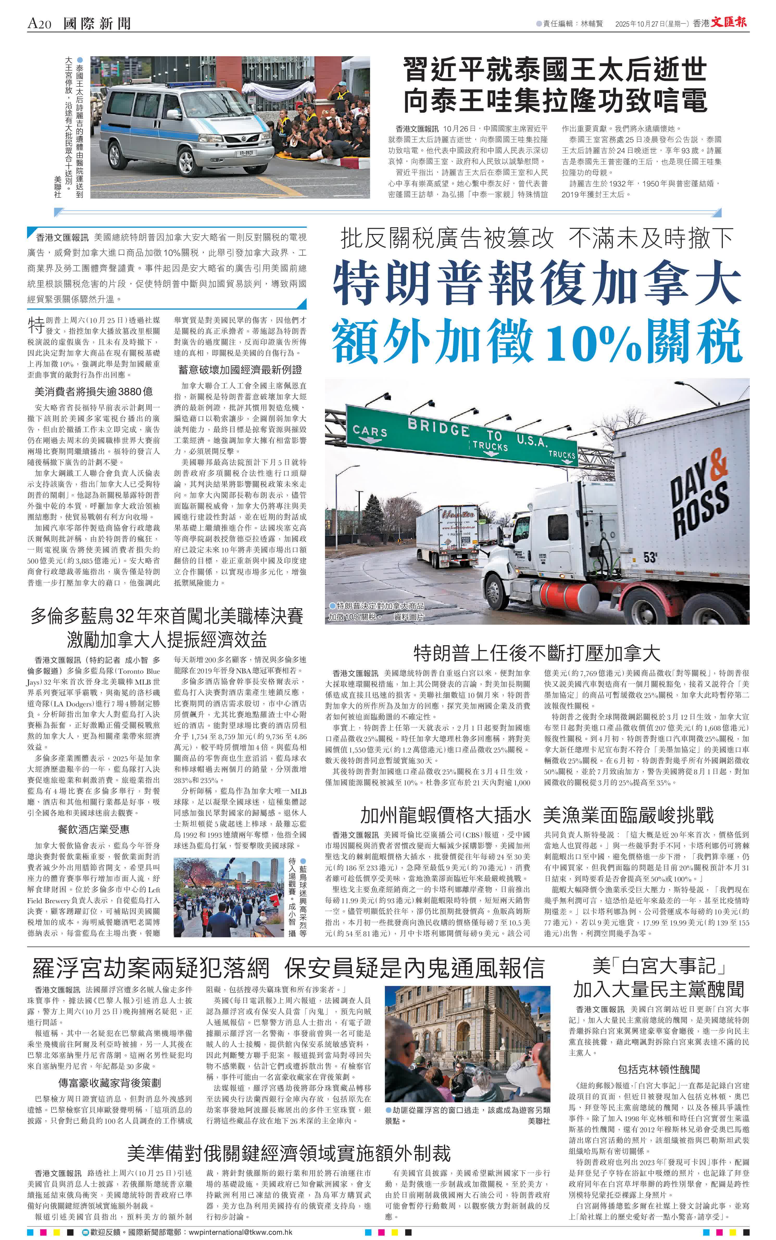 特朗普上周六(10月25日)透過社媒發文,指控加拿大播放篡改里根關稅演說的虛假廣告,且未有及時撤下,因此決定對加拿大商品在現有關稅基礎上再加徵10%,強調此舉是對加國嚴重歪曲事實的敵對行為作出回應。