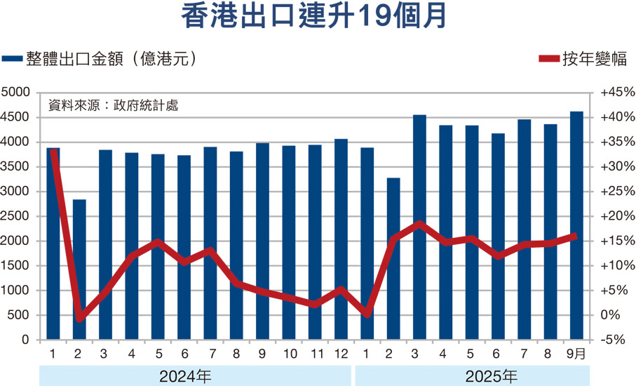特區政府發言人指出,9月商品出口貨值繼續顯著增長,輸往內地和大部分其他亞洲市場的出口蓬勃發展,同時大部分主要商品出口均見上升。展望未來,環球經濟持續擴張應能繼續支持香港商品貿易表現,但美國貿易政策仍為國際貿易流向帶來不確定因素,特區政府將密切監察情況並保持警覺。