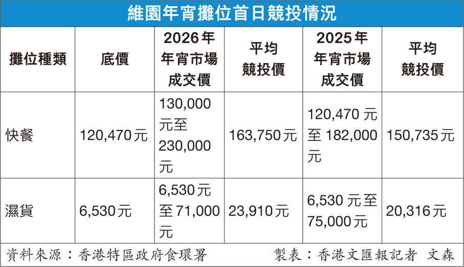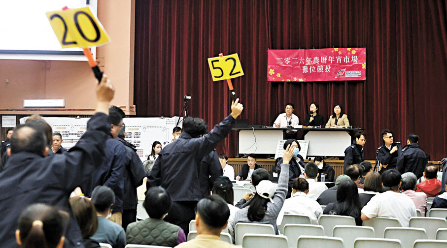 2026年農曆年宵市場將於明年2月11日至17日、一連7天在全港14個地點舉行,香港特區政府食環署由昨日起、一連3天為維園年宵市場合共400個攤位舉行公開競投,昨日率先推出4個快餐攤位及180個濕貨攤位。維園年宵市場競投的交投情況向來可堪稱是香港經濟與營商信心的寒暑表,昨日最受矚目的快餐攤位競投中,銅鑼灣出入口C檔經過激烈爭持下以23萬元成交成為「檔王」,較去年的18.2萬元最高成交價(位於同一出入口的D檔)高出約26%。至於濕貨攤位,最高成交價為7.1萬元,濕貨攤位總成交價430萬元,較去年增約75萬元。有投得濕貨攤位的檔主認為今年競爭較激烈,對銷情有信心;但亦有個別成功投得攤位者擔心北上消費熱潮,影響生意,希望特區政府加強向旅客宣傳。食環署表示,今年競投相對激烈,快餐攤位成交價格均比去年高,可見商戶看俏年宵市道。 ●文:香港文匯報記者 吳健怡 圖:香港文匯報記者 郭木又