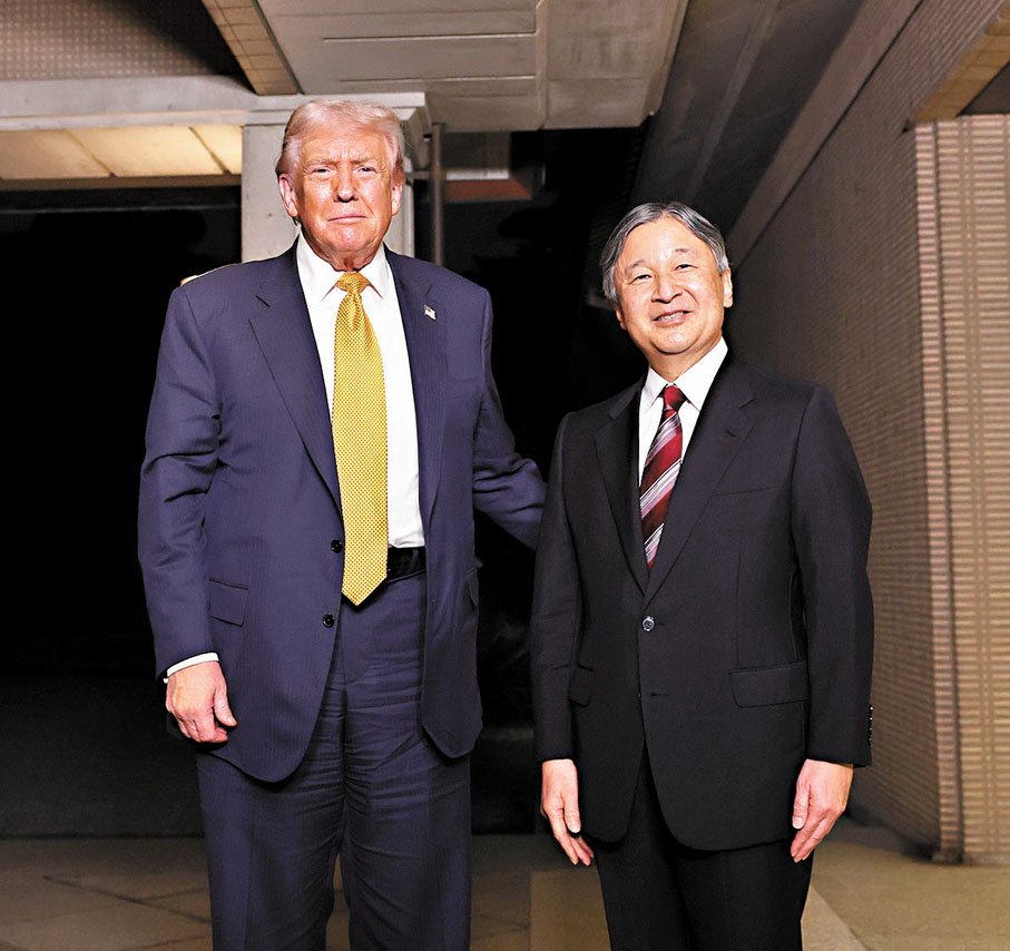 特朗普周一下午抵埗後,隨即到東京皇居與日皇德仁會面。特朗普將於周二上午與高市舉行雙邊會談,主要議題包括日本增加防衛費負擔及對美投資,兩人之後在迎賓館赤坂離宮共進午餐。隨後特朗普會視察美軍駐日橫須賀海軍基地並發表演說,他也預定與日本商界領袖共進晚餐。