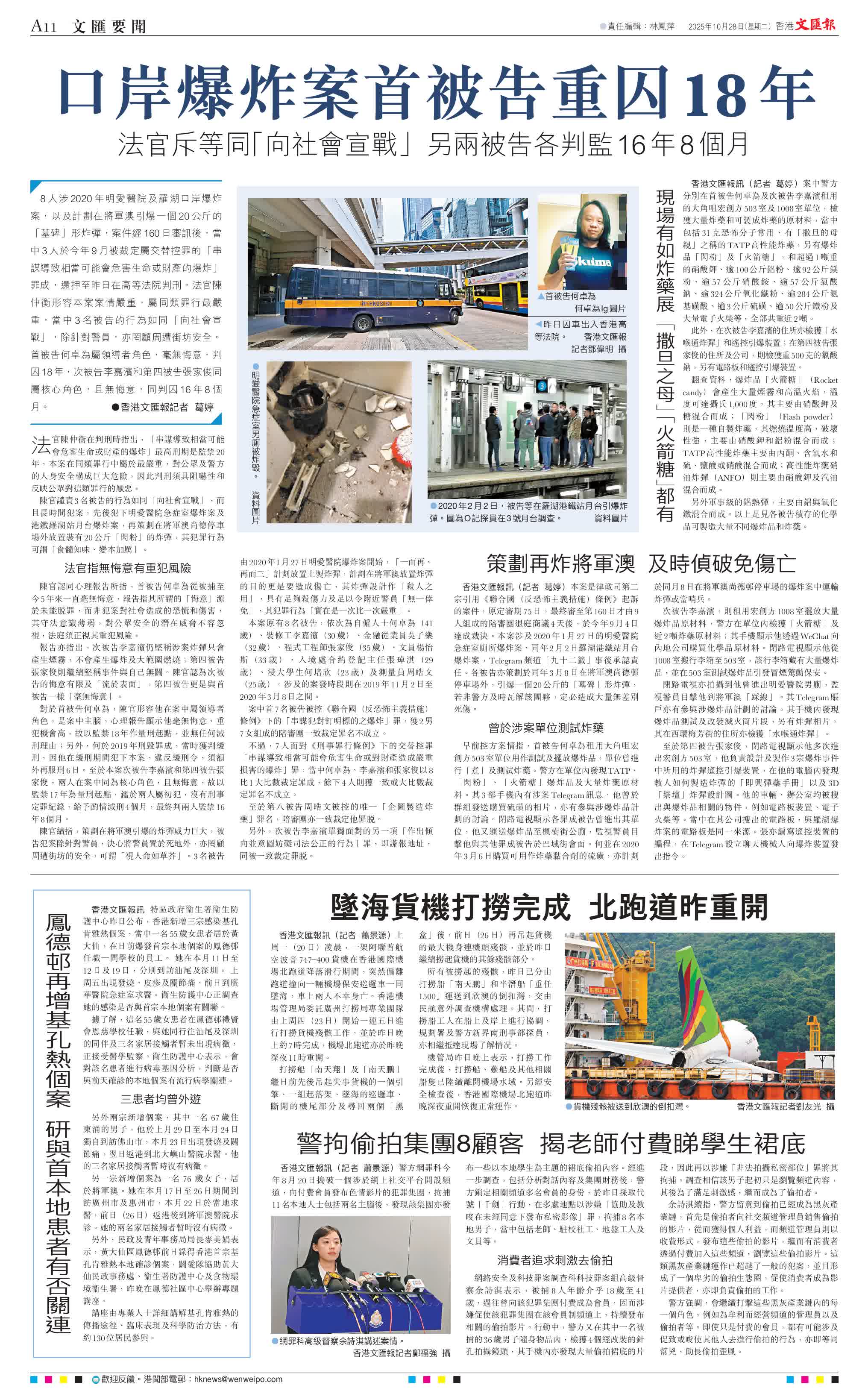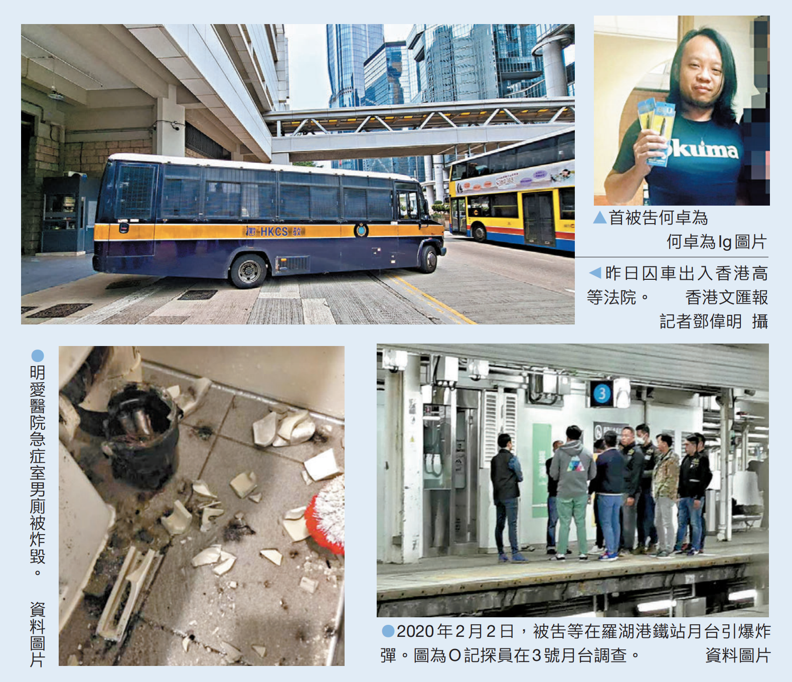 香港文匯報訊(記者 葛婷)8人涉2020年明愛醫院及羅湖口岸爆炸案,以及計劃在將軍澳引爆一個20公斤的「墓碑」形炸彈,案件經160日審訊後,當中3人於今年9月被裁定屬交替控罪的「串謀導致相當可能會危害生命或財產的爆炸」罪成,還押至昨日在高等法院判刑。法官陳仲衡形容本案案情嚴重,屬同類罪行最嚴重,當中3名被告的行為如同「向社會宣戰」,除針對警員,亦罔顧周遭街坊安全。首被告何卓為屬領導者角色,毫無悔意,判囚18年,次被告李嘉濱和第四被告張家俊同屬核心角色,且無悔意,同判囚16年8個月。