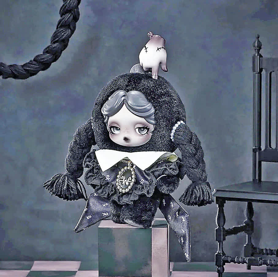 泡泡瑪特熱門IP形象SKULLPANDA,以前衛又個性的少女形象,在全球潮玩界掀起熱潮。她戴着標誌性的太空頭盔,梳着球狀辮子,扮演着多樣的角色,在不斷的變換與分裂中尋找真實的自我。黑暗又神秘的SKULLPANDA,與熱門劇集《星期三》中的女主角形象不謀而合,可愛、漂亮又暗黑的少女「星期三」,與周圍的青少年格格不入,以超脫年齡的智慧,展現冷面魅力。