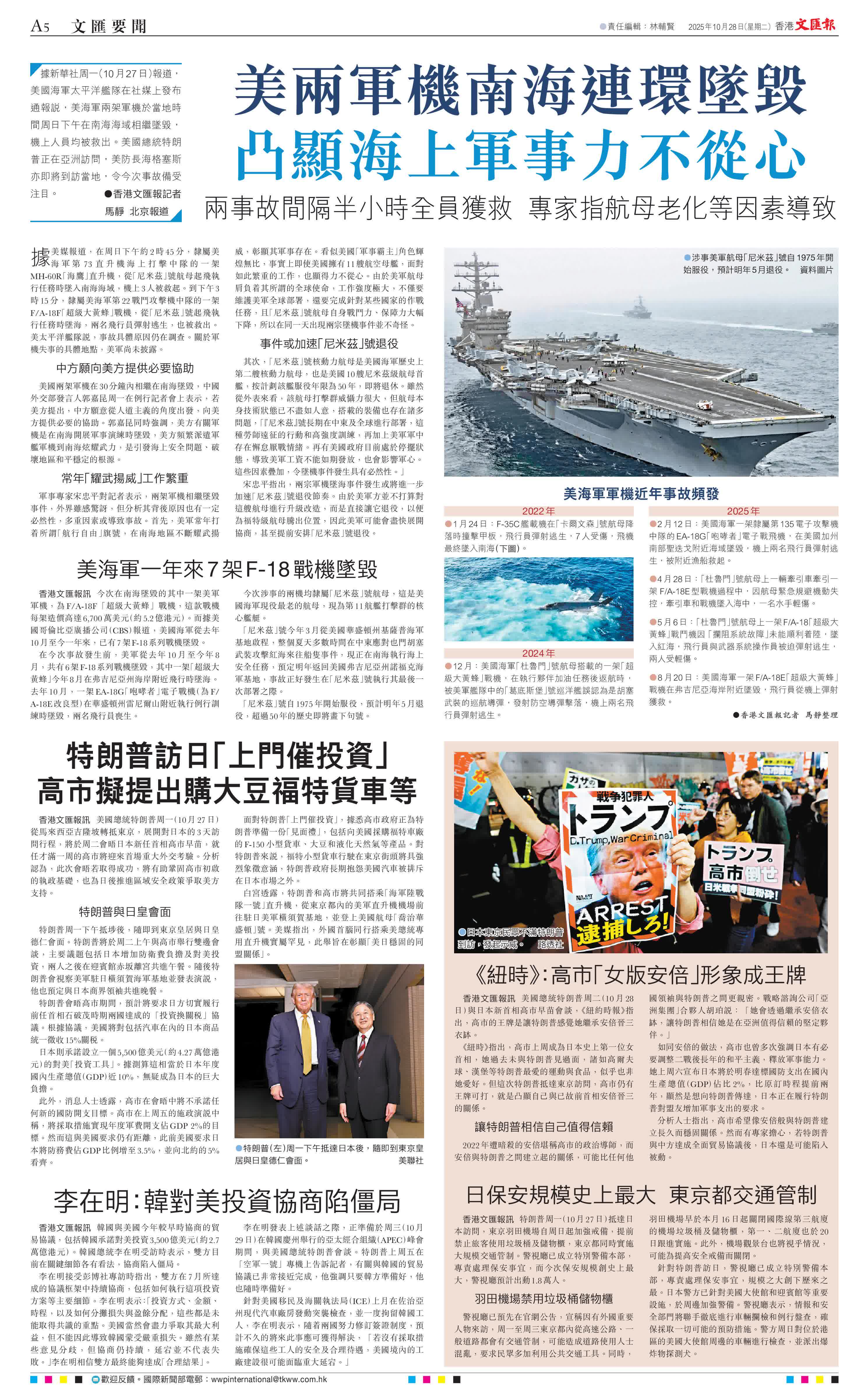(香港文匯報記者馬靜 北京報道)據新華社周一(10月27日)報道,美國海軍太平洋艦隊在社媒上發布通報說,美海軍兩架軍機於當地時間周日下午在南海海域相繼墜毀,機上人員均被救出。美國總統特朗普正在亞洲訪問,美防長海格塞斯亦即將到訪當地,令今次事故備受注目。