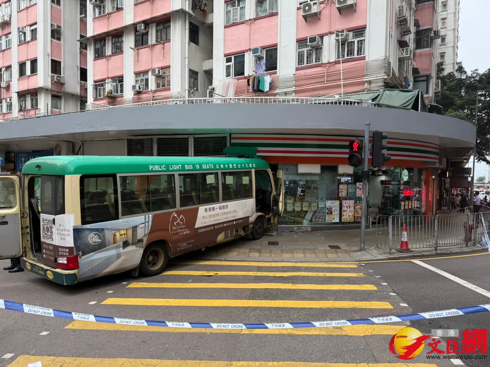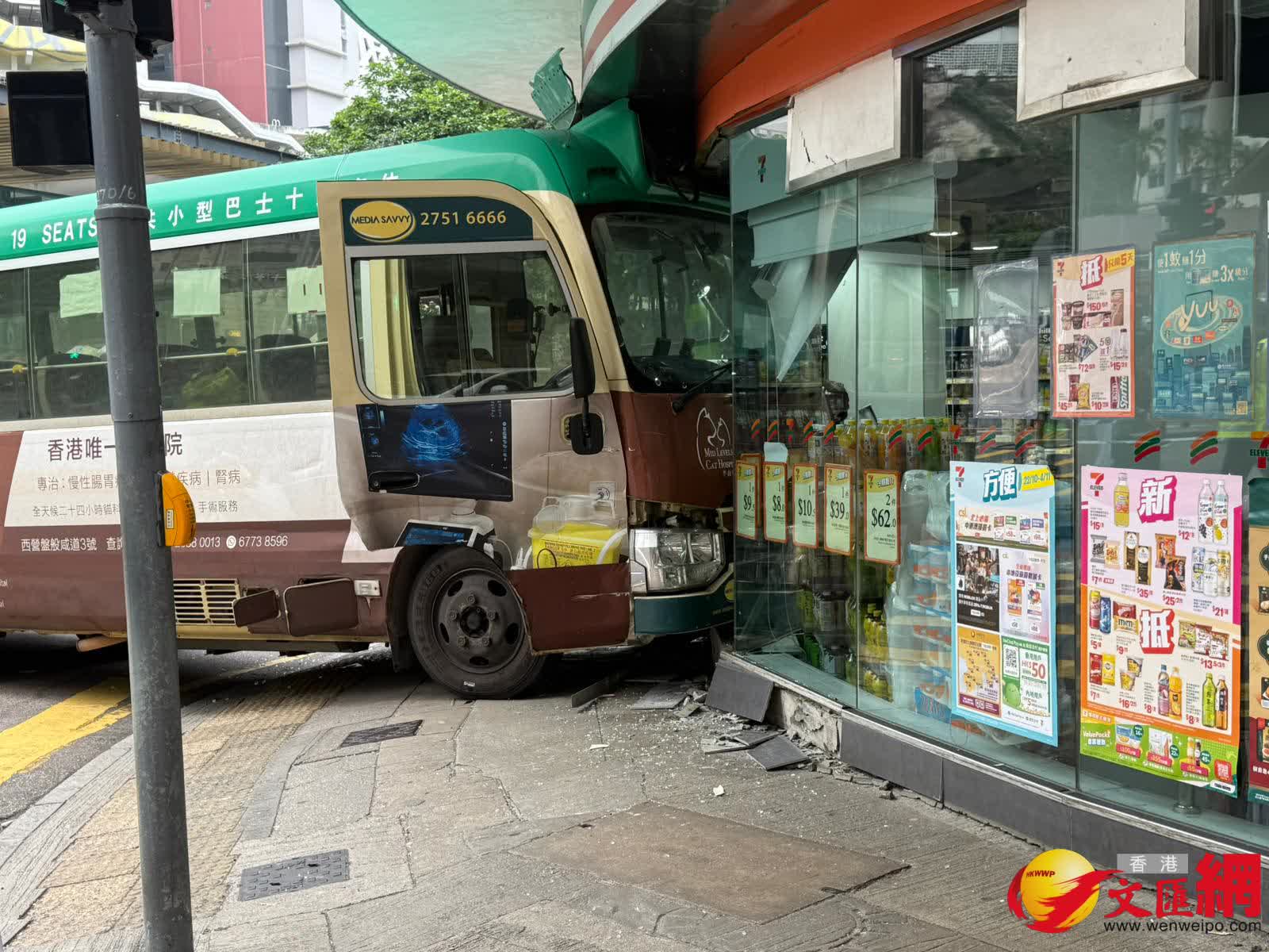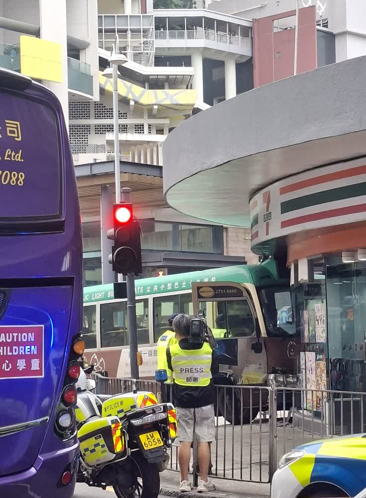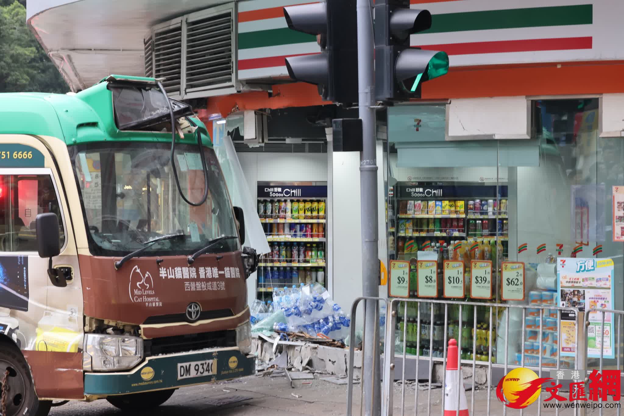 現場所見,肇事小巴車頭毀爛,擋風玻璃破裂,便利店一邊櫥窗玻璃被小巴車頭撞毀,碎片散滿一地,店內部分樽裝飲品亦被撞爆。