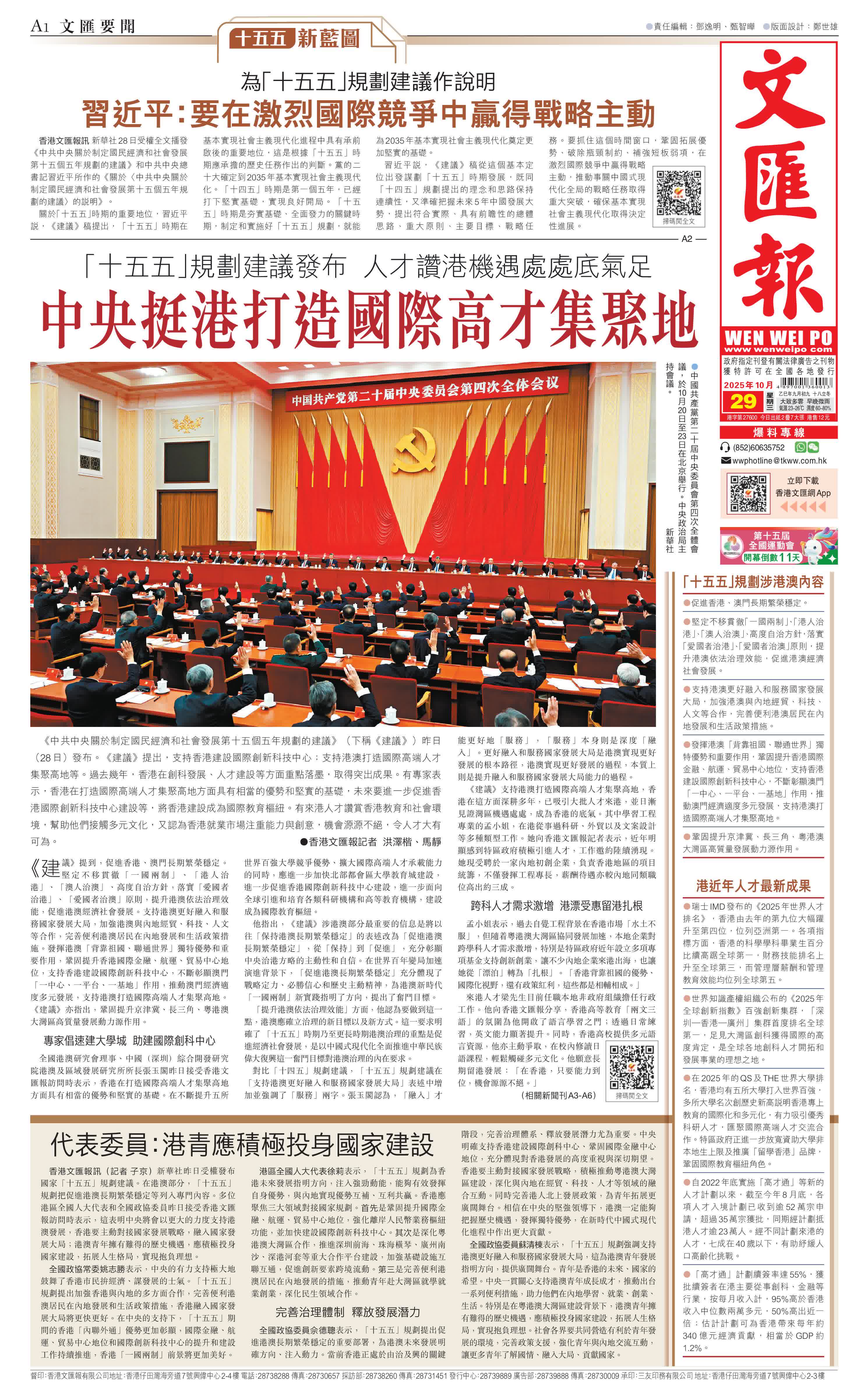 (香港文匯報記者 洪澤楷、馬靜)《中共中央關於制定國民經濟和社會發展第十五個五年規劃的建議》(下稱《建議》)昨日(28日)發布。《建議》提出,支持香港建設國際創新科技中心;支持港澳打造國際高端人才集聚高地等。過去幾年,香港在創科發展、人才建設等方面重點落墨,取得突出成果。有專家表示,香港在打造國際高端人才集聚高地方面具有相當的優勢和堅實的基礎,未來要進一步促進香港國際創新科技中心建設等,將香港建設成為國際教育樞紐。有來港人才讚賞香港教育和社會環境,幫助他們接觸多元文化,又認為香港就業市場注重能力與創意,機會源源不絕,令人才大有可為。