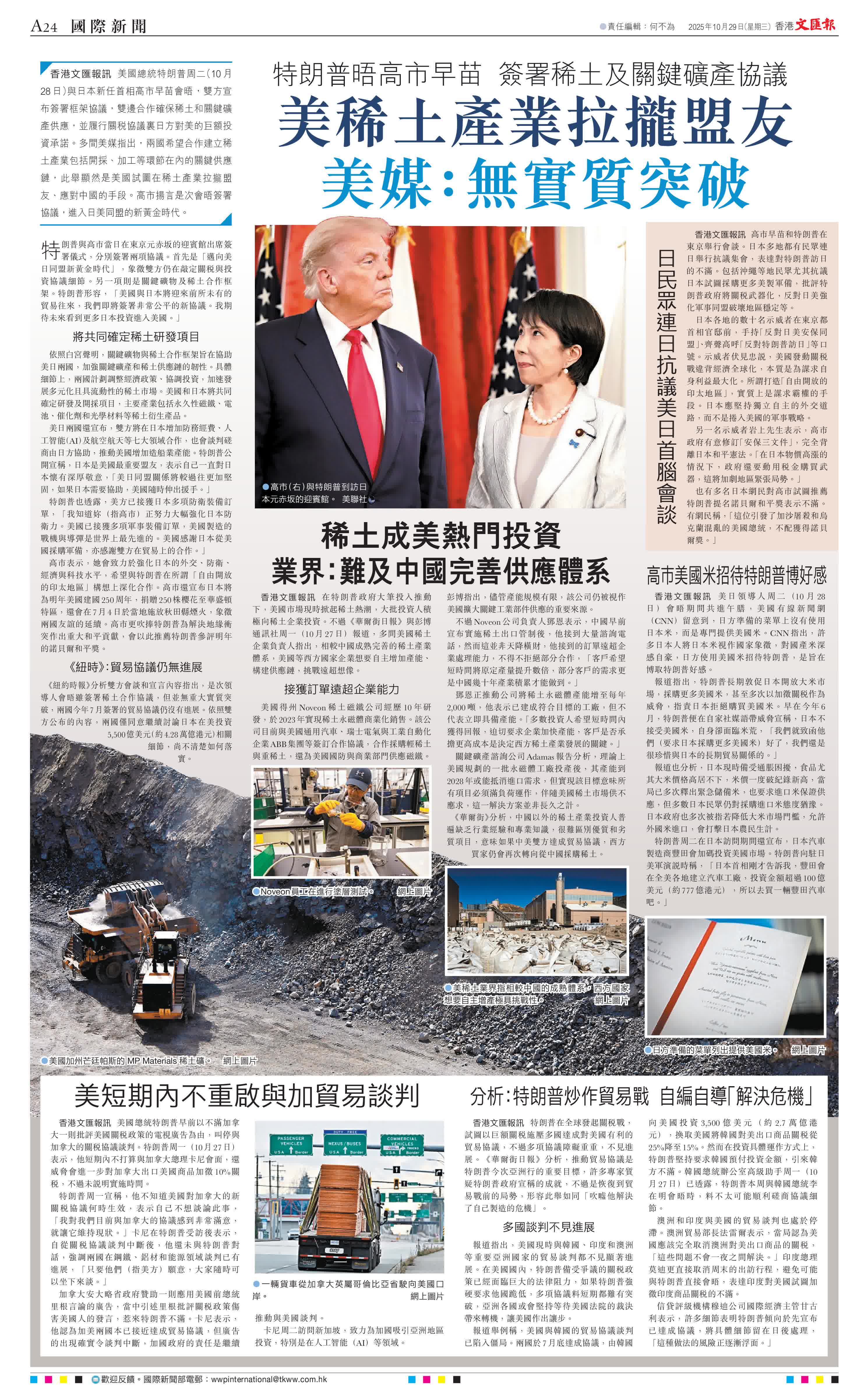 香港文匯報訊 美國總統特朗普周二(10月28日)與日本新任首相高市早苗會晤,雙方宣布簽署框架協議,雙邊合作確保稀土和關鍵礦產供應,並履行關稅協議裏日方對美的巨額投資承諾。多間美媒指出,兩國希望合作建立稀土產業包括開採、加工等環節在內的關鍵供應鏈,此舉顯然是美國試圖在稀土產業拉攏盟友、應對中國的手段。高市揚言是次會晤簽署協議,進入日美同盟的新黃金時代。
