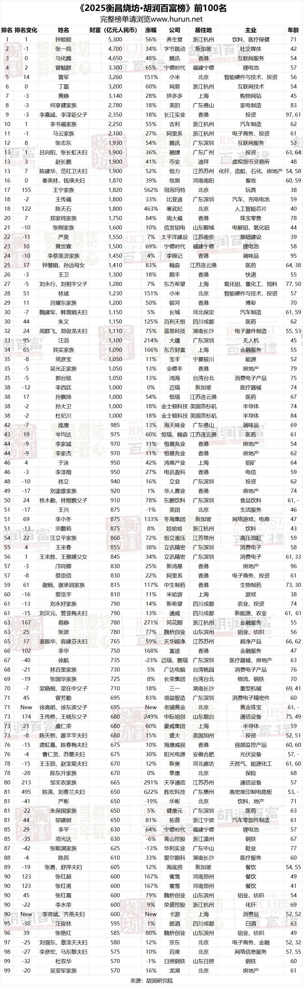 10月28日,胡潤研究院發布《2025衡昌燒坊·胡潤百富榜》。這是胡潤研究院自1999年以來連續第27次發布該榜單,財富計算截止日期為2025年9月1日。