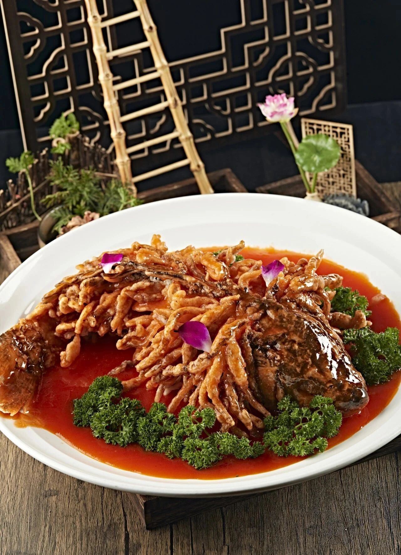 「金毛獅子魚」也是石家莊的經典名菜,它是將鯉魚先在魚身上片成薄片再剪成交錯的細絲,經油炸後使細絲散開、定型,彷彿蓬鬆的「獅子毛」,炸至金黃,澆上酸甜的湯汁,便是金毛獅子魚。