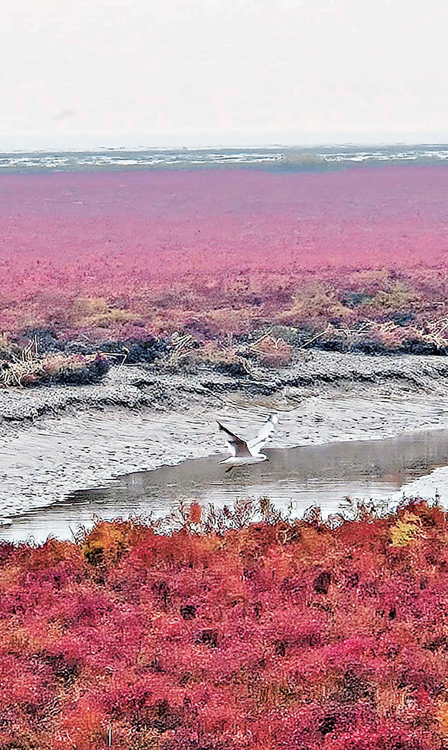 渤海之濱的沿海灘塗,海與陸地的邊緣,鹹淡水交界,鹽與鹼有機融合,天然紅海灘連結蘆葦蕩,共約10萬畝,是世界上面積最大、植被類型保護完好的蘆葦沼澤地,綠色鹼蓬草4月長出地面,漸次轉為嫩紅,繼而鮮紅。直至10月金秋,是全年觀賞的最佳時機,鹼蓬草展現色彩更為豐富,鮮紅、火紅、深紅和紫紅多種層次,在陽光照射下,壯觀遼闊的姹紫嫣紅,驚艷得來有點霸氣。