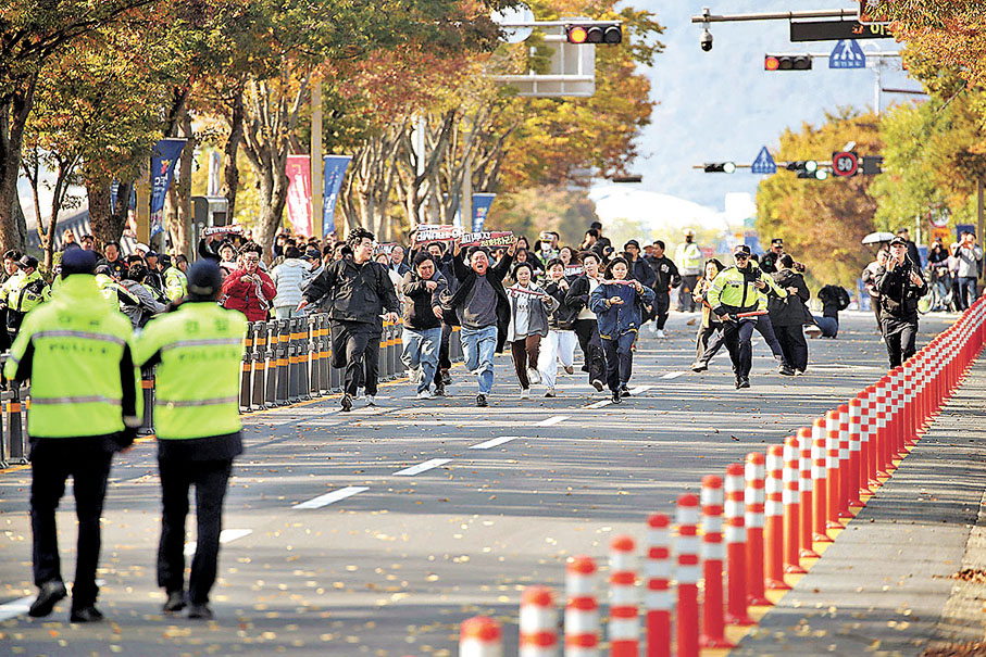 在慶州車站前,也有示威者聚集抗議特朗普政府徵收高額關稅,不滿特朗普要求韓國對美提供高額投資。慶州各地部分示威者與警方發生小規模衝突,警方表示會場外區域屬安全區,不得舉行集會,多數示威者與警方交流後離開。
