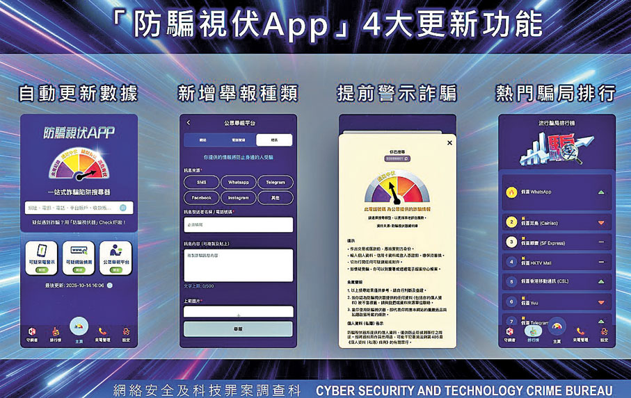 網絡安全及科技罪案調查科總警司林焯豪表示,警方分別於2022年及2023年推出的「防騙視伏器」及其手機版「防騙視伏App」,於去年2月更新功能,於日前再次升級,加入全新人工智能分析引擎及自主執行任務,主要有三種人工智能技術,包括代理式人工智能、電腦視覺及自然語言處理技術,令「防騙視伏App」增加四個新功能,包括自動更新數據功能,系統會在手機連接網絡及「防騙視伏App」在背景運行時,自動將最新的詐騙資料庫推送到用戶的手機,用戶能隨時擁有最新防騙情報。