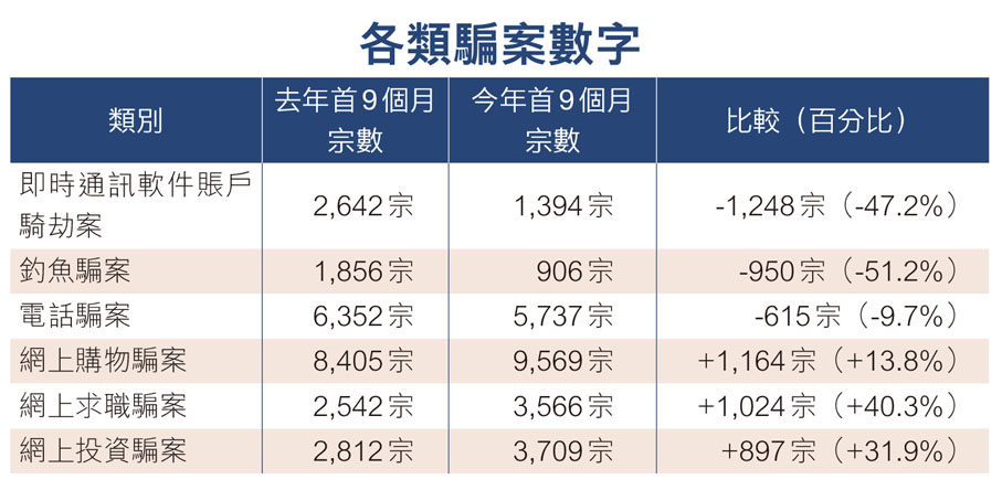 騙案類型方面,即時通訊軟件賬戶騎劫案、釣魚騙案及電話騙案均錄得下跌,網上購物騙案、網上求職騙案及網上投資騙案錄得顯著升幅(見附表),網購騙案上升主要源自今年本地多項大型活動的門票騙案,網上求職與投資騙案升勢則主要由於今年初盛行的刷單騙案和轉趨活躍的投資氣氛。今年首9個月,警方就詐騙案共拘捕4,552人,並持續進行情報主導的拘捕行動,瓦解活躍於本地的詐騙集團。