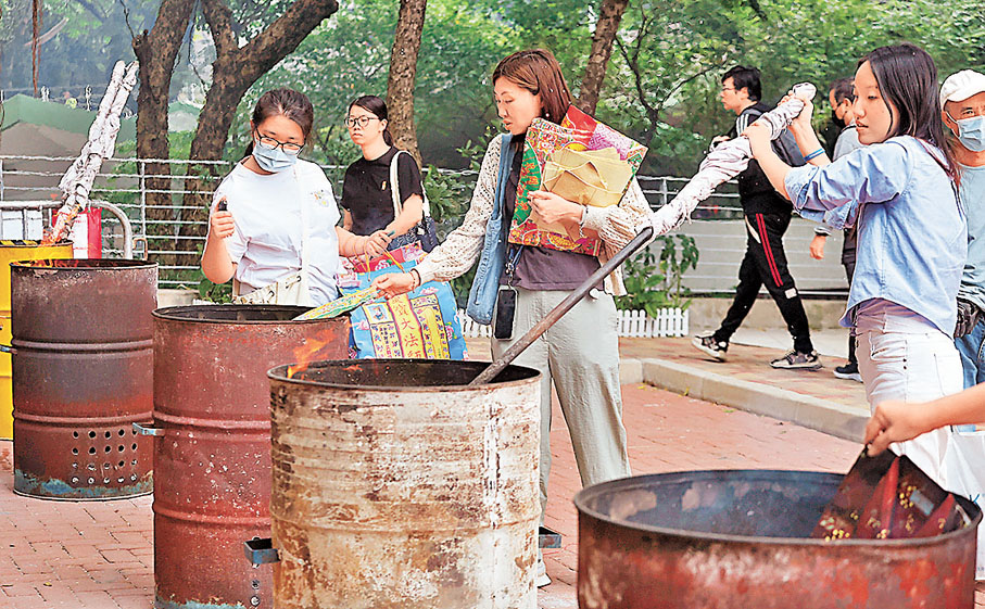 靈灰安置所入口附近,有人使用焚化爐燃燒冥鏹。李小姐表示,燒衣是出於對先人的掛念,希望他們在「另一世界」衣食無憂。她提到,今年祭品價格與往年相若,她自行挑選搭配代替購買現成的衣包,「花費約160元,現成衣包也需100多元,自行搭配只是貴少少,其實整體來說都差不多。」