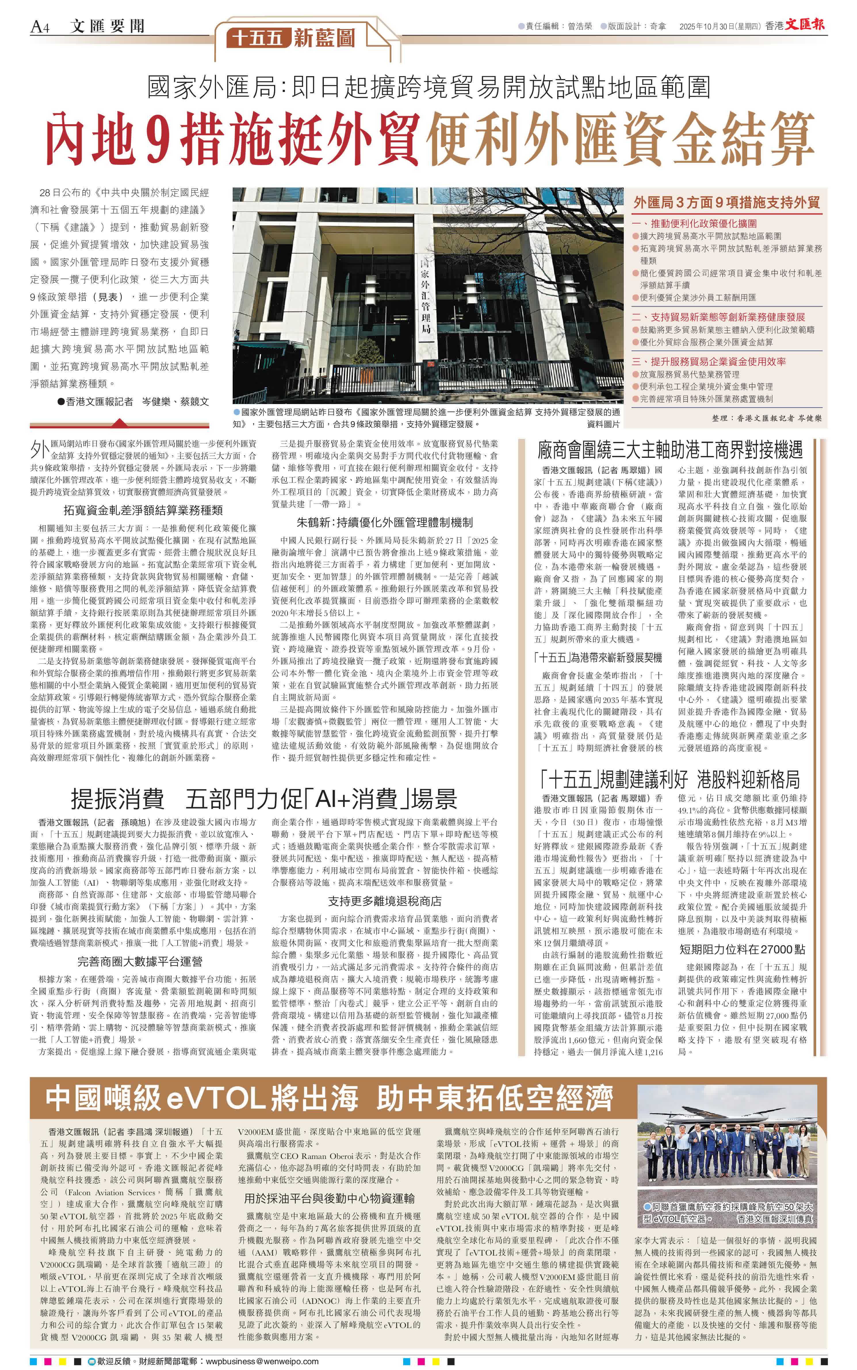 香港文匯報訊(記者 李昌鴻 深圳報道)「十五五」規劃建議明確將科技自立自強水平大幅提高,列為發展主要目標。事實上,不少中國企業創新技術已備受海外認可。香港文匯報記者從峰飛航空科技獲悉,該公司與阿聯酋獵鷹航空服務公司(Falcon Aviation Services,簡稱「獵鷹航空」)達成重大合作,獵鷹航空向峰飛航空訂購50架eVTOL航空器,首批將於2025年底啟動交付,用於阿布扎比國家石油公司的運輸,意味着中國無人機技術將助力中東低空經濟發展。