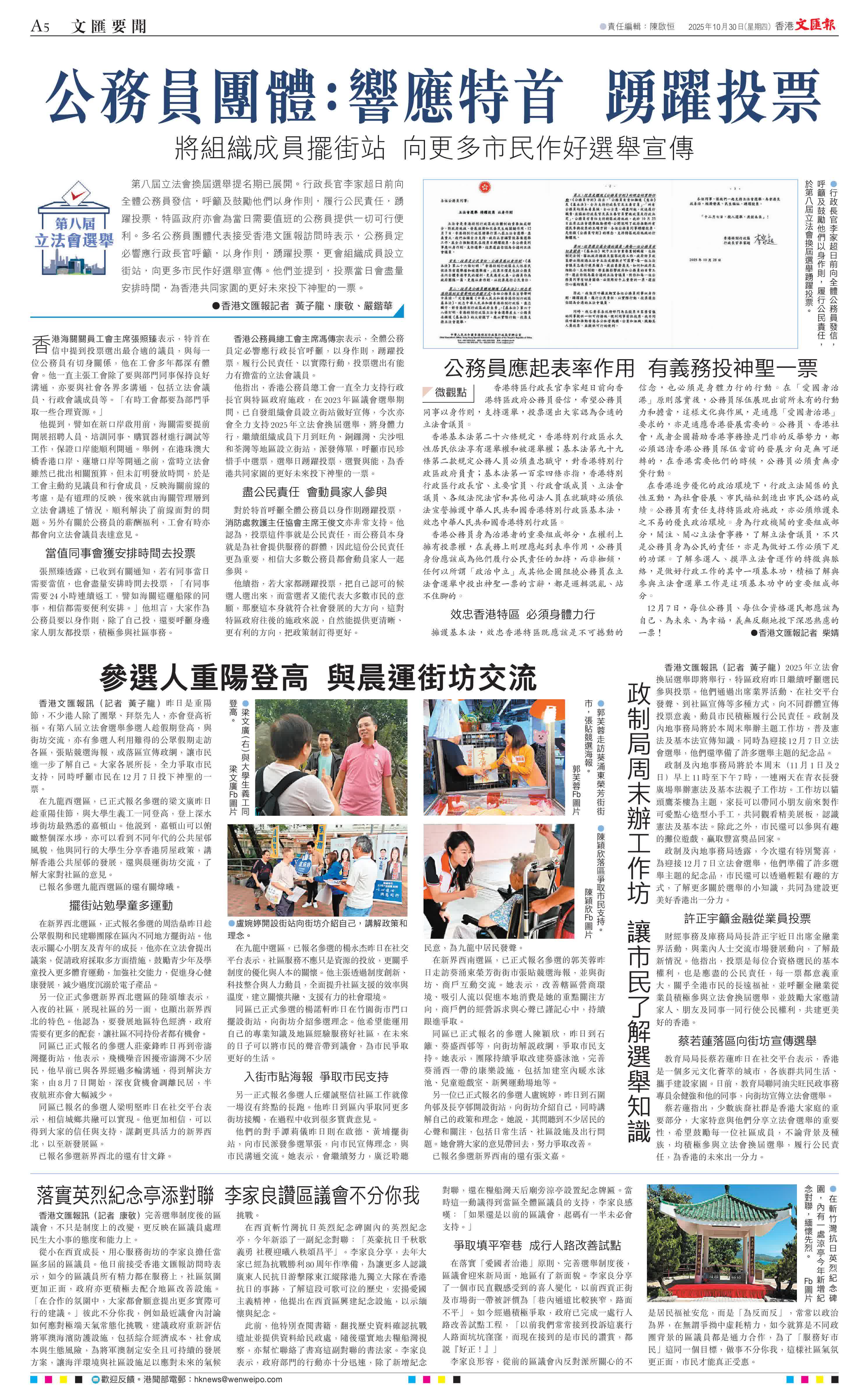 他指出,香港公務員總工會一直全力支持行政長官與特區政府施政,在2023年區議會選舉期間,已自發組織會員設立街站做好宣傳,今次亦會全力支持2025年立法會換屆選舉,將身體力行,繼續組織成員下月到旺角、銅鑼灣、尖沙咀和荃灣等地區設立街站,派發傳單,呼籲市民珍惜手中選票,選舉日踴躍投票,選賢與能,為香港共同家園的更好未來投下神聖的一票。