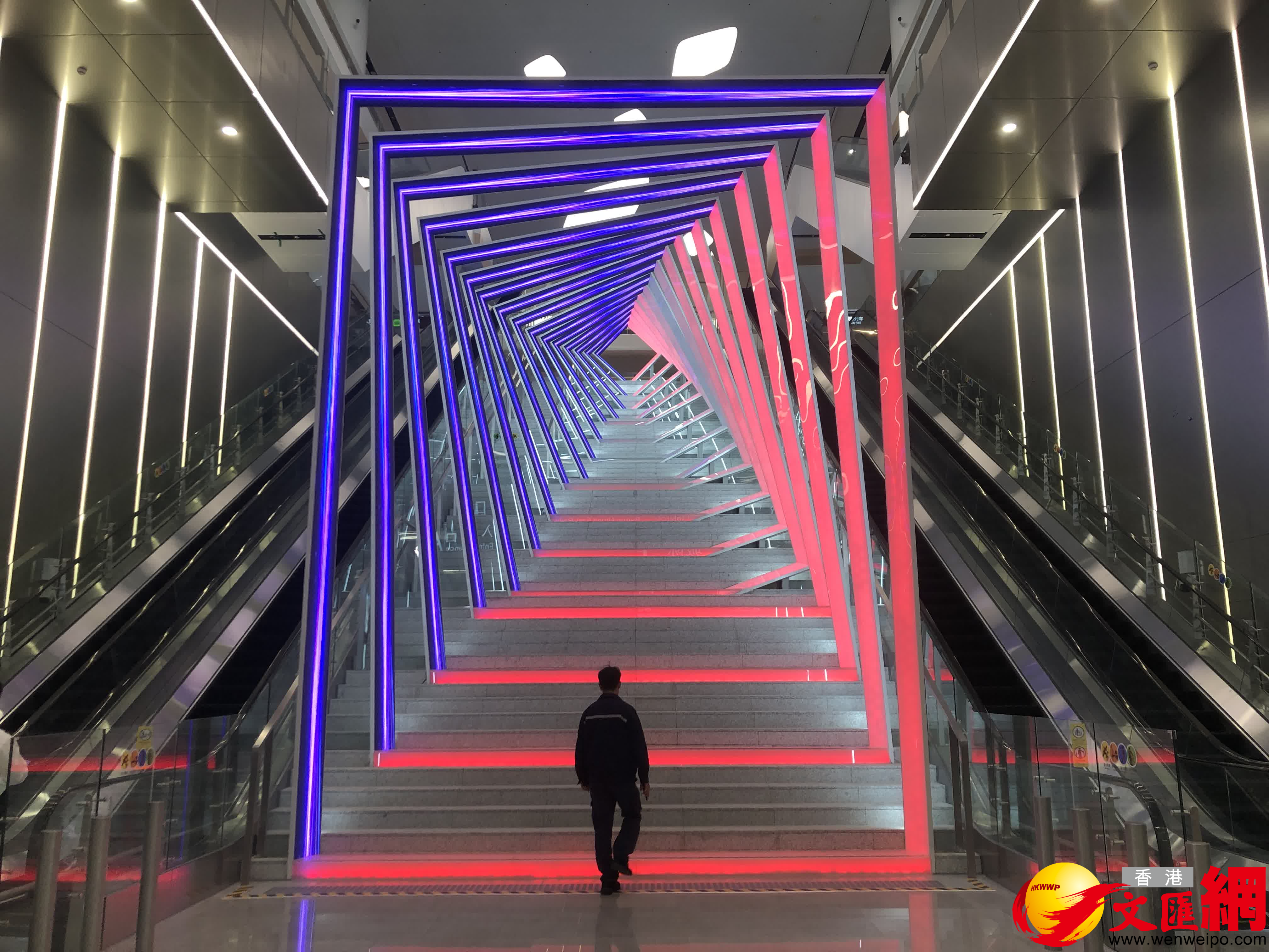 記者現場看到,T3綜合交通中心採用地下兩層布局,公共區設計以「羊城啟航·絲路新篇」為核心,將「飛機啟航」的動感意象、北京路古道的歷史底蘊與絲綢之路的貿易精神融合。作為軌道交通與機場樞紐的核心銜接空間,景觀樓梯以「時空穿梭・樞紐對話」為設計理念,以「數字門戶」為靈感原點,成為廣州城市形象的「第一眼名片」。
