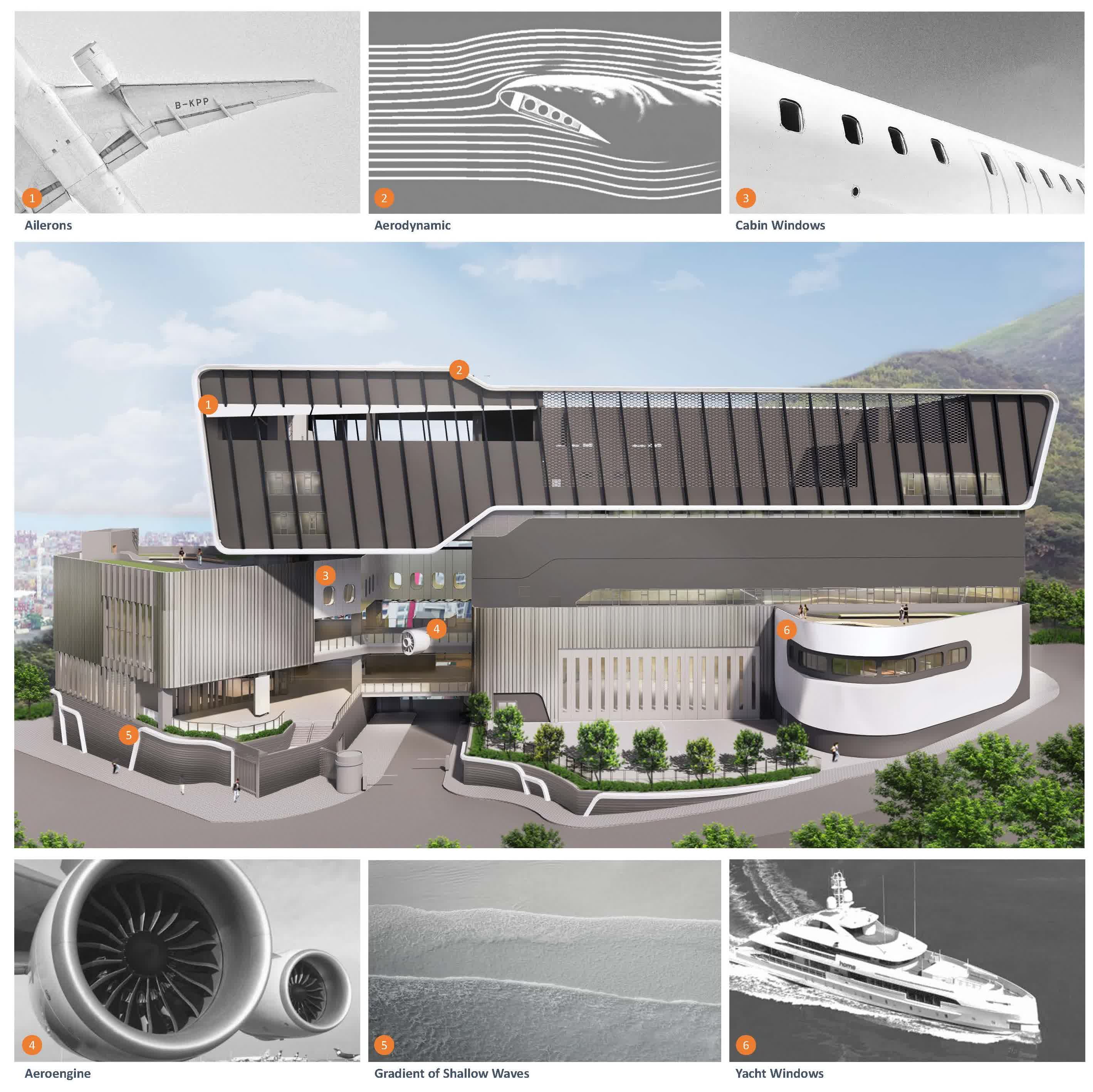 VTC航空及航海教育中心的設計榮獲「建築設計—教育設施(興建中項目)」金獎。這座樓高七層的中心將於2025/26學年啟用,設計靈感源自飛機與船隻的流線形態,上層結構如展開的機翼與登機橋,下層則以海岸波浪漣漪為概念,整體造型充滿科技感與動感,展現前瞻學習精神。設計團隊進行深入環境數據分析,參考太陽軌跡與日照量規劃窗戶佈局、玻璃選材和屋頂系統,巧妙提升自然採光與通風效能,將能源效益、使用者舒適度與建築美學完美融合。