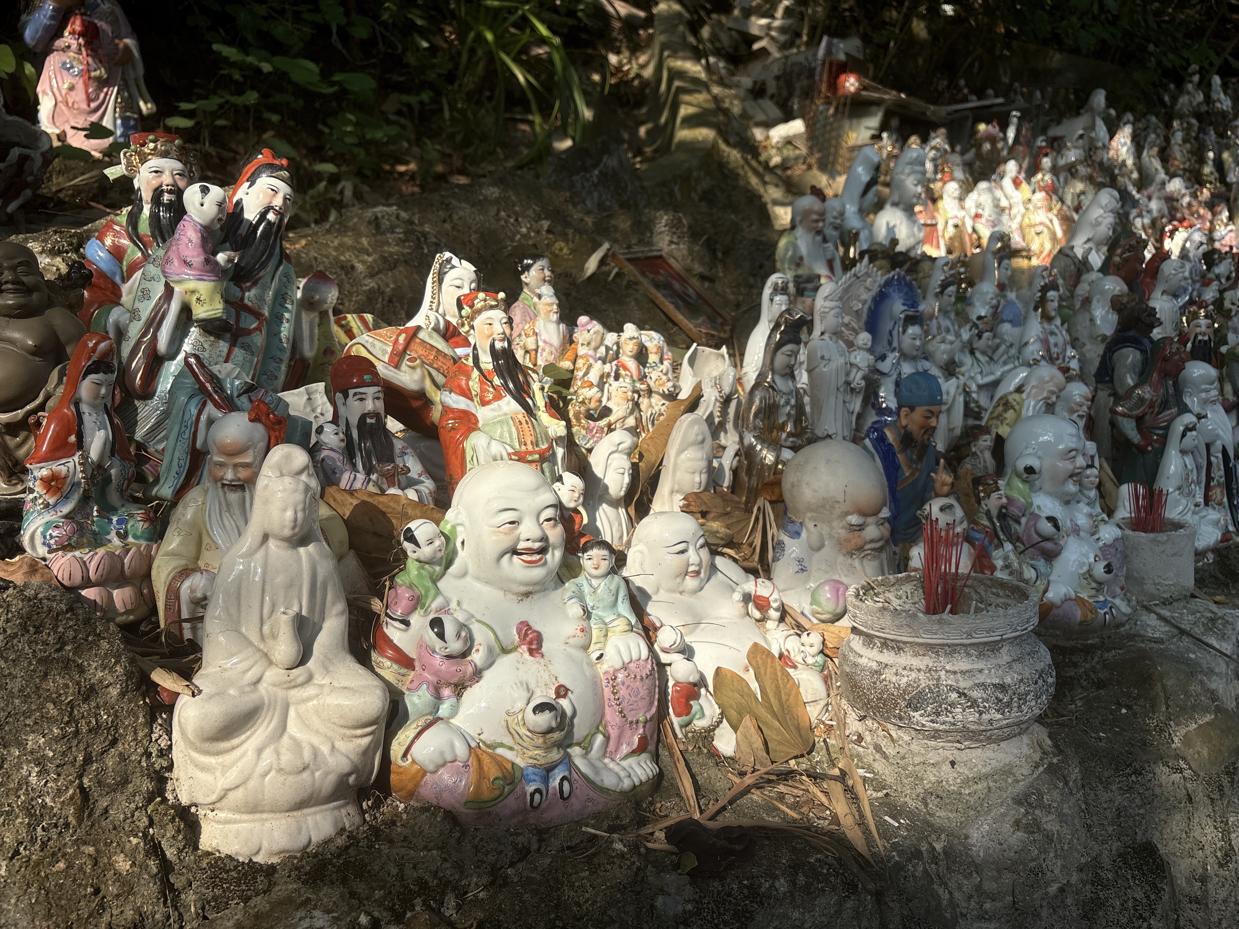 食完午餐悠閒散步,沿瀑布灣道行入瀑布灣公園。一路下行來到公園南面,伴隨海浪拍岸的聲音愈發清晰,可見道路逐漸狹窄,來到一處擺滿瓷器神像的山坡。各路神佛在此各顯神通,有觀音、彌勒佛、福祿壽三星,甚至是招財貓,有管理員定期打理,眾神像前亦是香火不斷。神像山形成的原因,其實是附近居民為自家棄置的神像找一個妥善安置處,長此以往,規模逐漸壯大,預估已超過8,000座。行走其間,有一種既神秘又莊嚴的氛圍。繼續向下走即達富貴泳灘,有兩三人在淺海處游水,不遠處還有阿叔垂釣,十分悠閒愜意。在這裏可倚靠欄杆遠眺南丫島、長洲島、大嶼山,感受海風拂面,享受醉人海景。