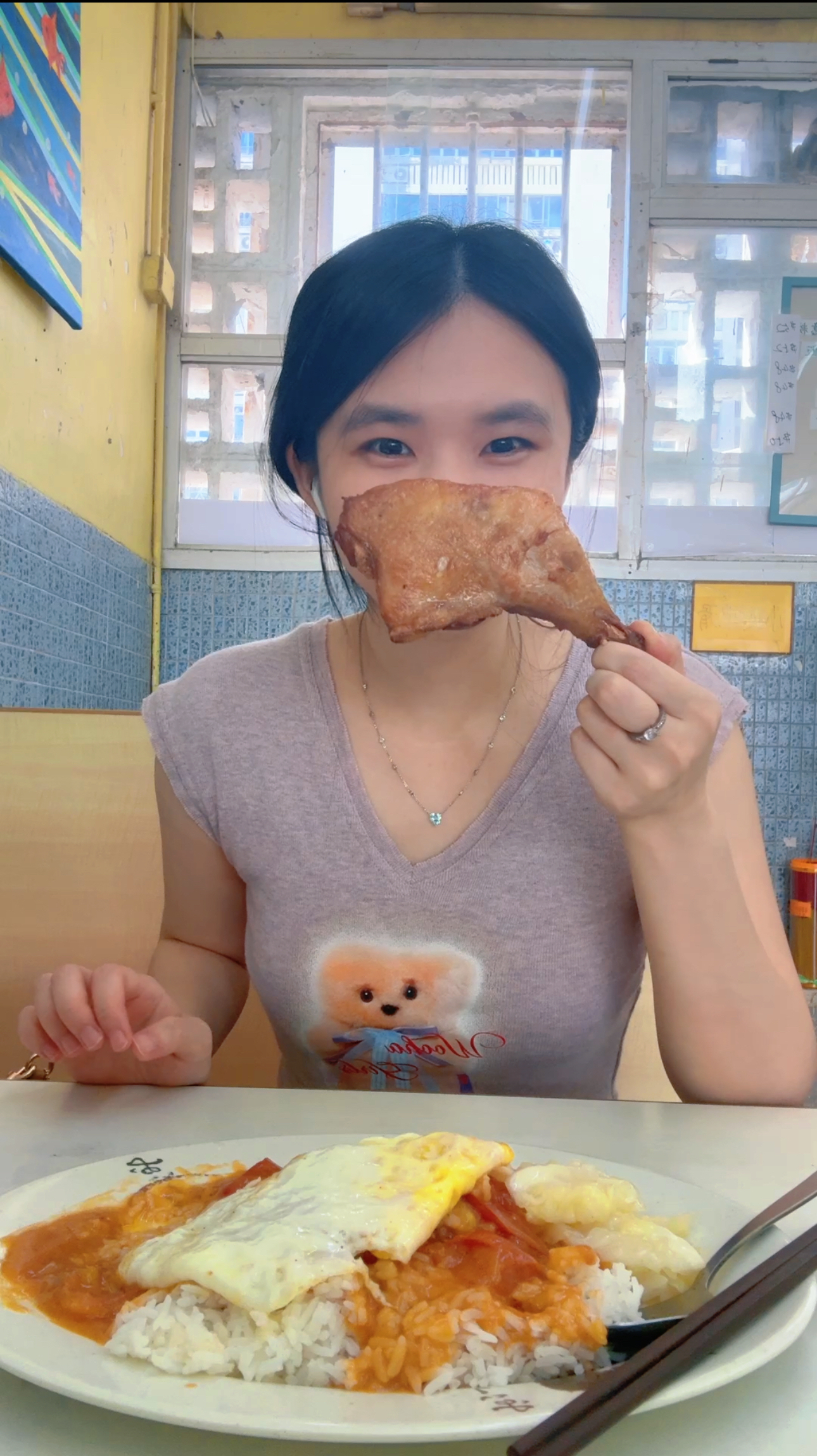 坐落於華富邨華光樓707-708號的銀都冰室,已默默陪伴街坊度過半世紀,店舖招牌、格仔瓷磚都恰似舊時模樣,走入店內便能感受到頭頂吊扇帶來的一陣清涼。在木椅坐下,就有店員過來熱情招呼,時不時與顧客閒聊,很有人情味。點餐方面,除菜單上的定食,還有每天都更新的是日快餐,慳妹垂涎這間的雞髀已久,於是點了50元的鮮茄汁雞髀煎蛋飯,套餐還跟一杯咖啡或奶茶,加2元可以轉凍飲,性價比都幾高。飯菜上桌,米飯上淋滿酸甜的茄汁,頂上卧有一片荷包蛋。當然最誘人的一定是煎得外皮焦脆的大雞髀,一啖落去,軟嫩爆汁,皮脆肉香。食完飯還可打卡一下店內的復古裝潢,明黃色牆面掛有許多油畫,文藝氣息撲面而來。注意店內消費只收現金,不過沒帶都不用慌張,出店門不遠處就有自動櫃員機。