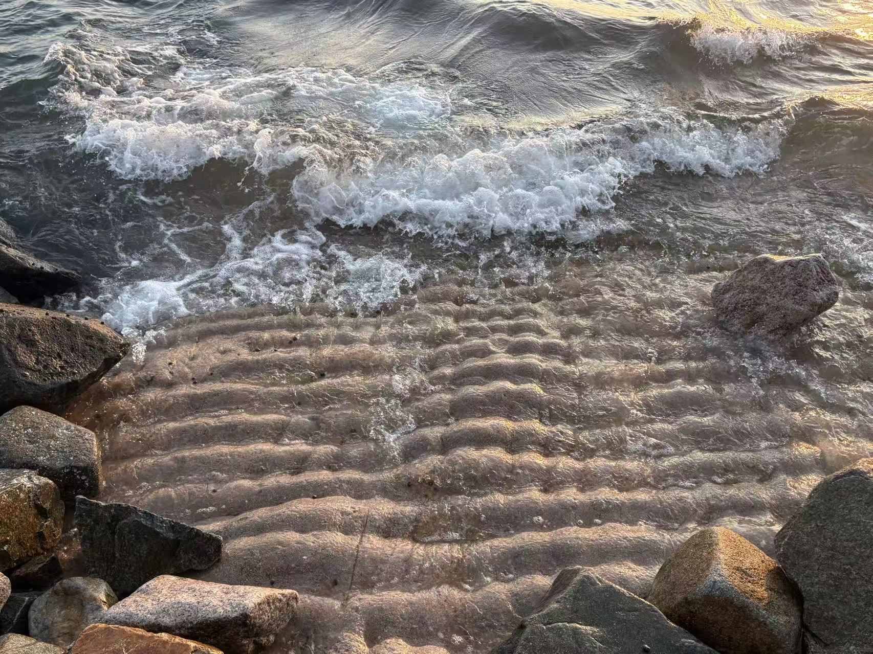 由瀑布出發,可沿石灘前往雞蛋仔石,並不能吃,而是形似雞蛋仔的塊狀岩石。石灘上亂石多,許多稍小的石頭踏上去還會晃動,因此要來一定記得穿上防滑的運動鞋。並且雞蛋仔石只有潮落時才會出現,常常是在日落時分近天黑時得見,大家切勿為了打卡忽視安全。慳妹到時,雞蛋仔石猶抱琵琶半遮面,不過太陽已逐漸墜入海平線,為海面撒上碎金,景色也格外美麗。