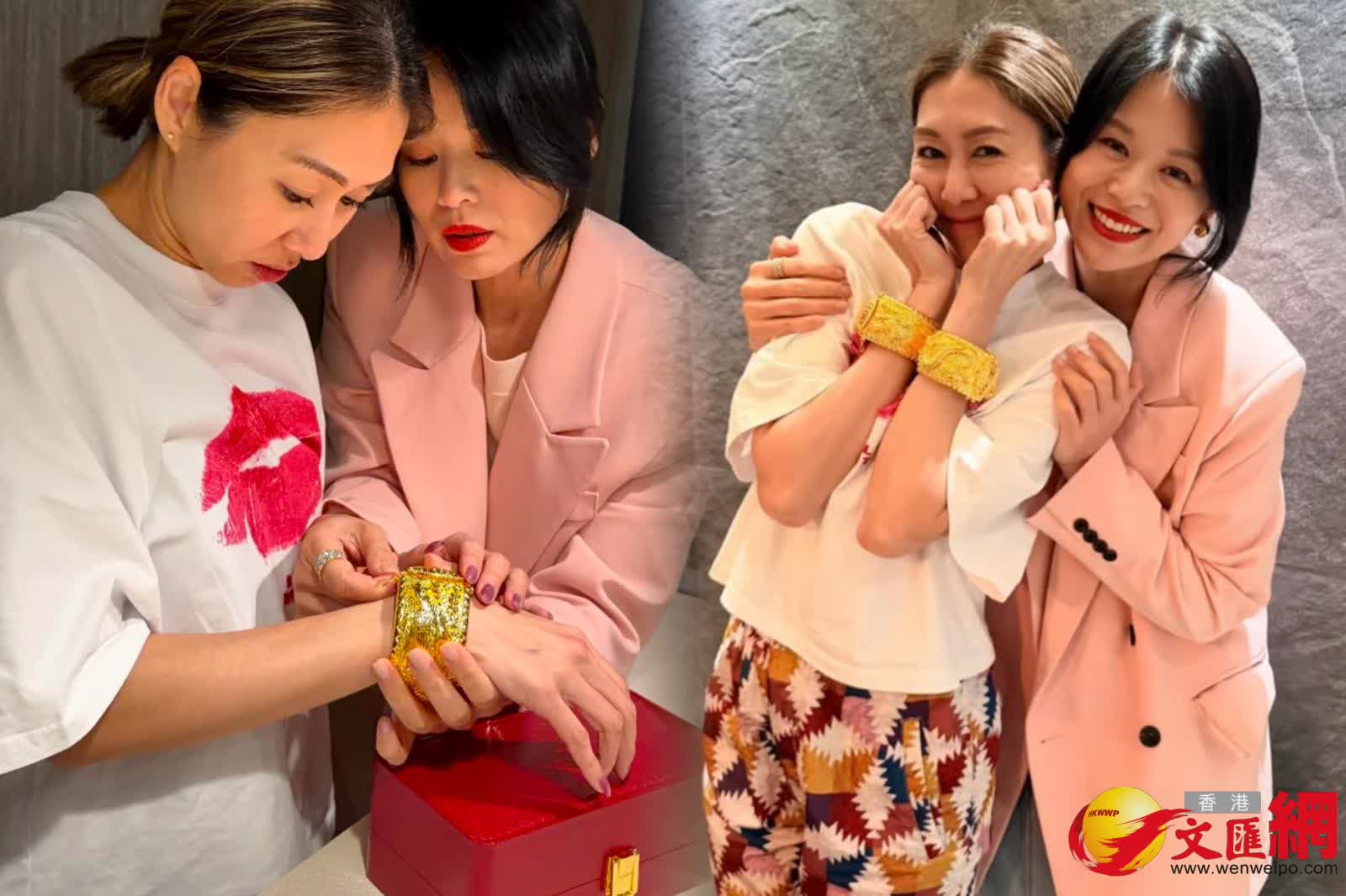 香港文匯報訊(記者 余雁)胡定欣與醫生男友陳健華閃婚,其好姊妹杏兒此前曾表示知道定欣已返港,但卻未有見面。昨晚定欣在社交平台晒照,照片中見杏兒送上一對龍鳳鈪,並為定欣戴上,定欣留言:「她送我禮,好姊妹果然講得出做得到,她真的真的送我一對龍鳳鈪。無論金價有多高,我都會好好收藏!謝謝我的姊妹胡杏兒。哈哈!下次要戴住做Show」網友再恭喜定欣之外,有眼利的網友指定欣腹部似肚凸凸疑有喜。