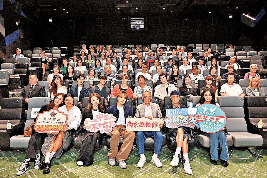 香港文匯報訊 英皇電影一直積極於港澳地區發行愛國主旋律電影,當中於9月在香港公映、以抗日戰爭時期南京大屠殺為題材、由申奧執導的《南京照相館》至今已累積超過750萬港元票房,成績理想。英皇集團主席楊受成博士與英皇娛樂集團行政總裁張雅麗近日拉大隊,率領過百英皇集團員工,連同藝人張敬軒、歐陽震華、鄧小巧、何珮瑜、林涵、陳國邦、黎展峯、洪助昇、黎明德、黎峻、劉若寶、Bobo@The Lemon Ones、Jero@The Lemon Ones以及Christine Cheng一同到英皇戲院觀賞電影。