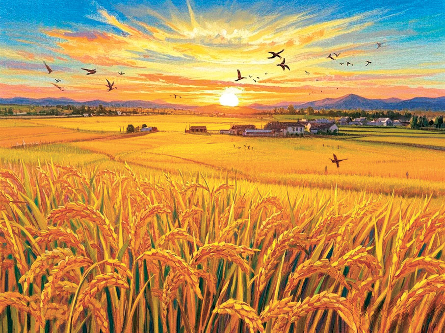 傍晚五點多,緋色的晚霞籠罩着村莊,稻垛已在車斗裏壘成顫巍巍的金山。當遇到下坡路時,我會興奮地大叫:「爸爸,衝啊!」父親便會配合地加快速度,讓風灌滿我們的衣衫;遇到上坡路時,我和兄長就在後面推着車。等到爬完坡,我再次爬上高高的稻堆,俯瞰整個田野,而夕陽把我們的影子拉得很長很長。