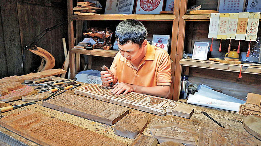 在四堡雕版印刷展覽館一旁的「子仁屋」內,馬力和徒弟正忙着製作新的雕版文創訂單。桌上擺滿了各式刻刀、刷具和雕版。夕陽下,木屑翻飛。