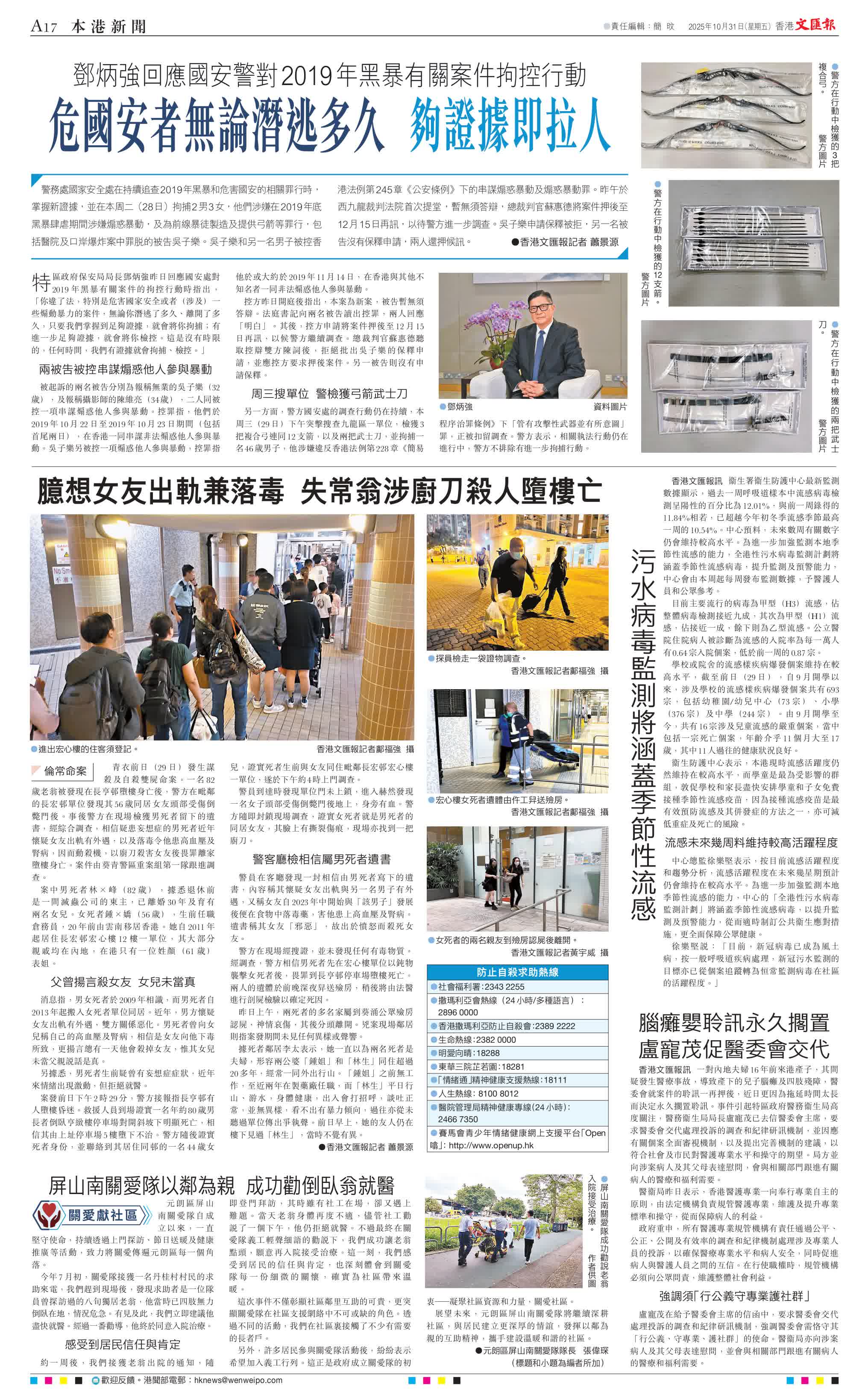香港文匯報訊(記者 蕭景源)青衣前日(29日)發生謀殺及自殺雙屍命案。一名82歲老翁被發現在長亨邨墮樓身亡後,警方在毗鄰的長宏邨單位發現其56歲同居女友頭部受傷倒斃門後。事後警方在現場檢獲男死者留下的遺書,經綜合調查,相信疑患妄想症的男死者近年懷疑女友出軌有外遇,以及落毒令他患高血壓及腎病,因而動殺機,以廚刀殺害女友後畏罪離家墮樓身亡。案件由葵青警區重案組第一隊跟進調查。