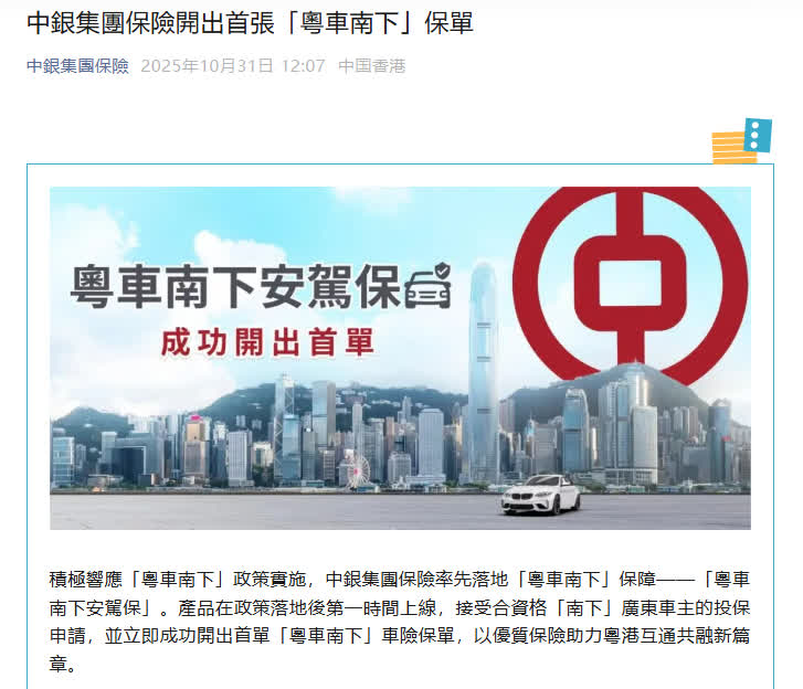積極響應「粵車南下」政策實施,中銀集團保險率先落地「粵車南下」保障——「粵車南下安駕保」。產品在政策落地後第一時間上線,接受合資格「南下」廣東車主的投保申請,並立即成功開出首單「粵車南下」車險保單,以優質保險助力粵港互通共融新篇章。