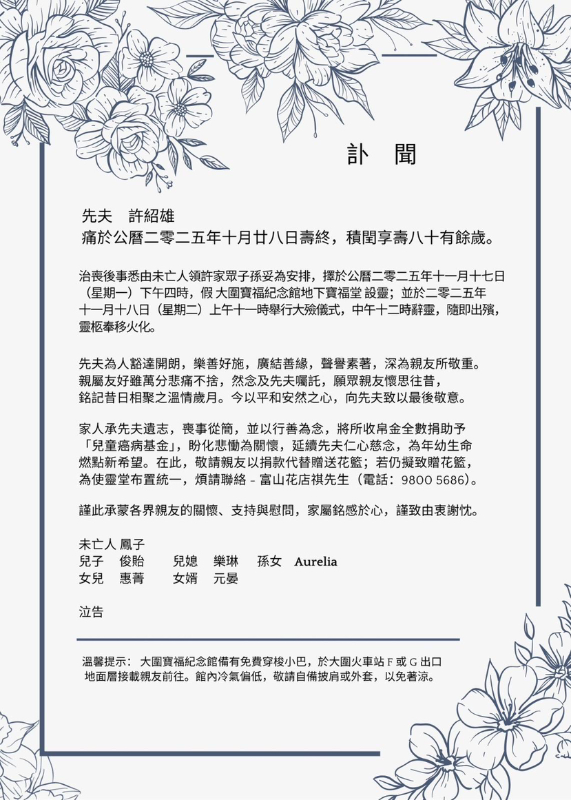 其家人承許紹雄遺志行善,將所收帛金全數捐助予 「兒童癌病基金」,盼化悲慟為關懷,為年幼生命燃點新希望。