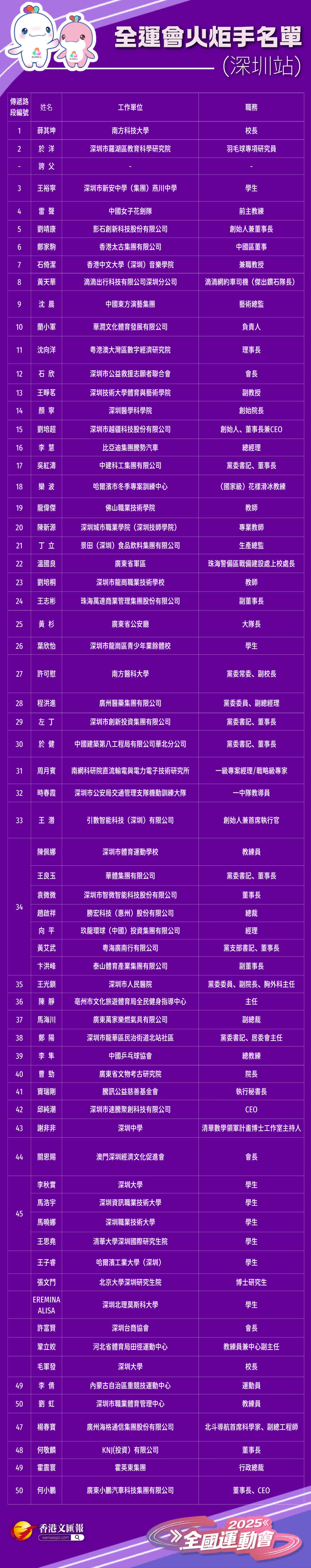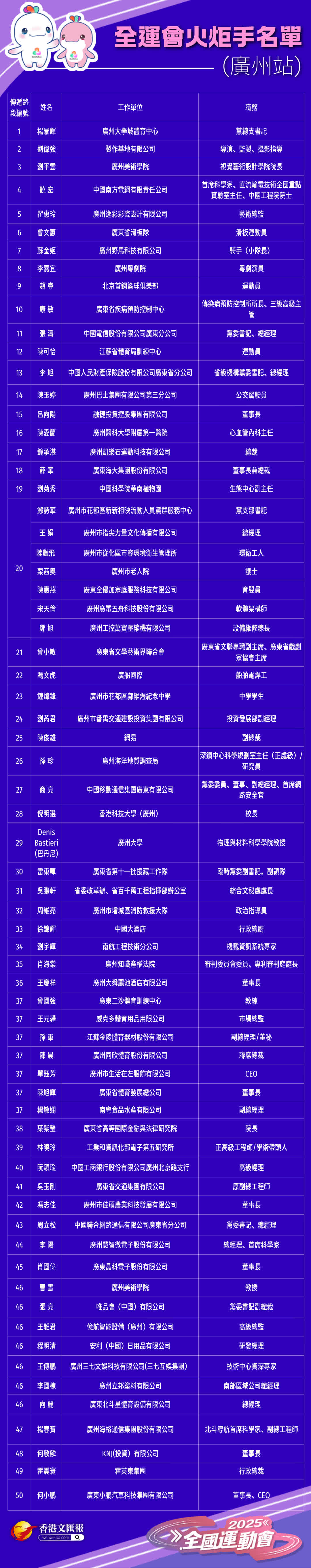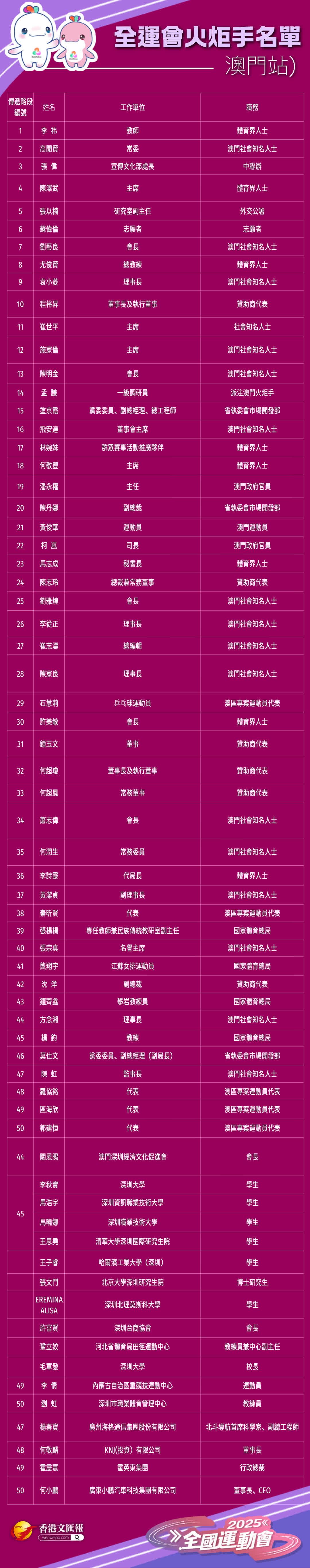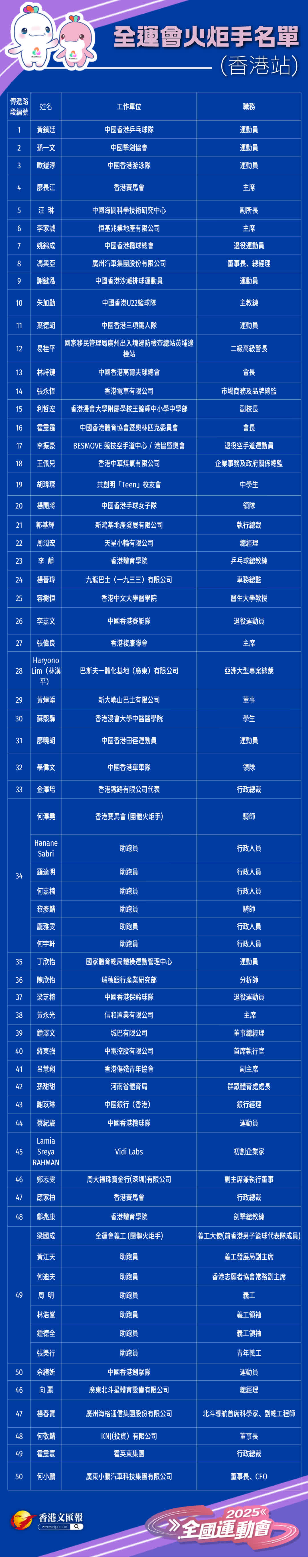 香港文匯報訊 (記者 郭正謙 敖敏輝) 十五運會將於本月9日正式開幕,十五運會火炬傳遞將於周日(2日)舉行,共有200棒火炬傳遞,其中香港站共有50名火炬手,而火炬手名單昨日亦正式公布,當中42名由香港提名,當中約一半為體育界代表,其餘8名由十五運會組織委員會提供,港隊男子乒乓球手黃鎮廷擔任第一棒,而最後一棒則為港隊劍擊運動員佘繕妡,另外沙排運動員謝鍵泓、七欖港隊隊長蔡紀駿等現役運動員均有入選,佘繕妡表示對成為最後一棒火炬手深感榮幸,亦形容是「會珍惜一輩子的難忘經歷」。