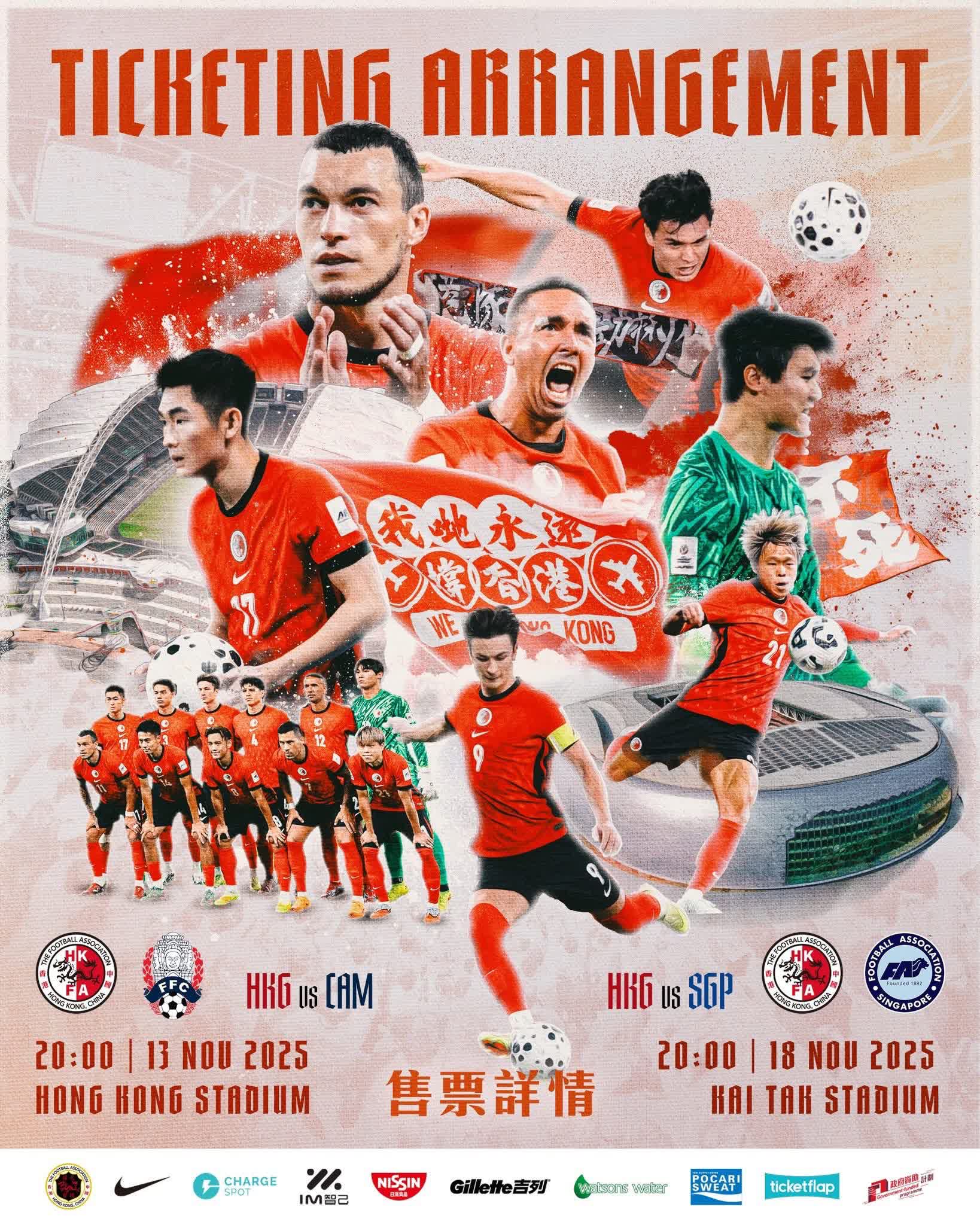 港足目前在亞洲盃外圍賽C組與新加坡同樣四戰得八分,雙方將於11月18日在啟德體育園正面交鋒,爭奪小組首名出線資格。港隊期望透過11月13日與柬埔寨的友賽提升狀態,全力備戰與新加坡的關鍵一役,由於啟德體育園當日舉行全運會七人欖球賽,賽事將移師至香港大球場上演。票價方面分為標準門票港幣160元及特惠票港幣40元,首500名購買標準門票的球迷更可獲得優先資格,於11月4日率先預購最多兩張對新加坡的主場球迷區下層門票,並將於11月3日前收到電郵通知購票安排。
