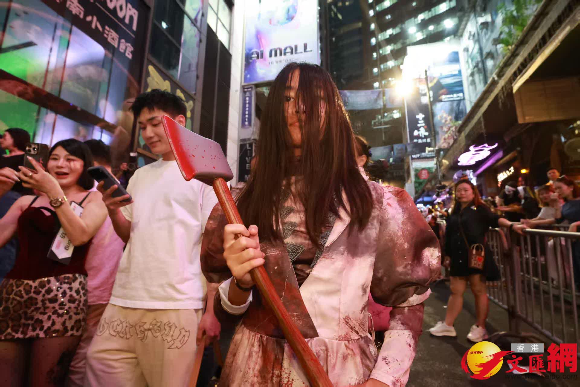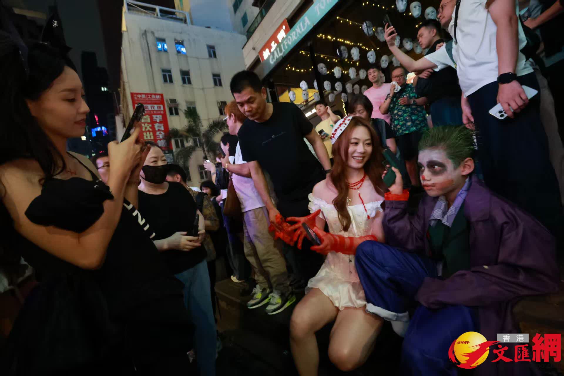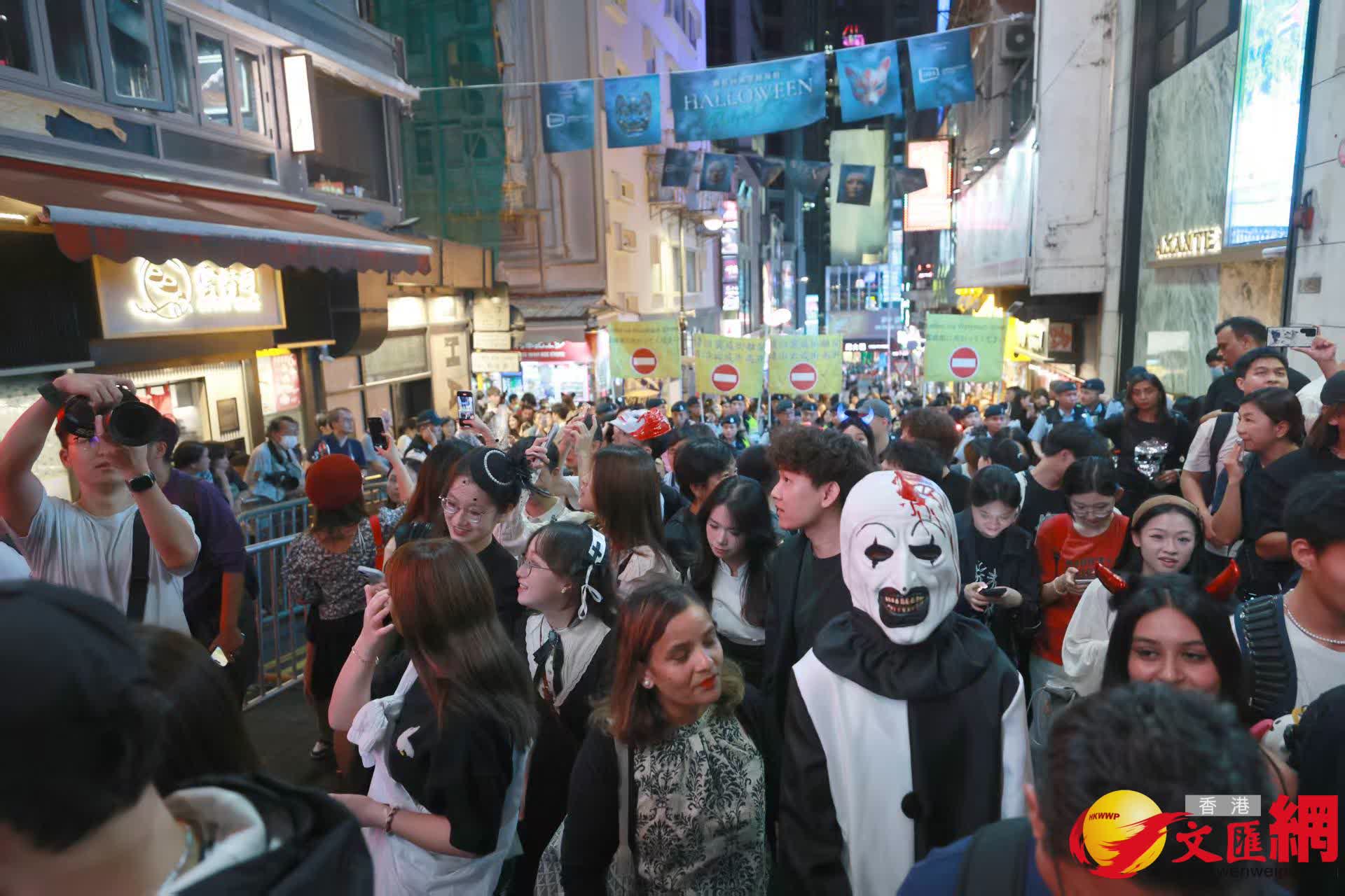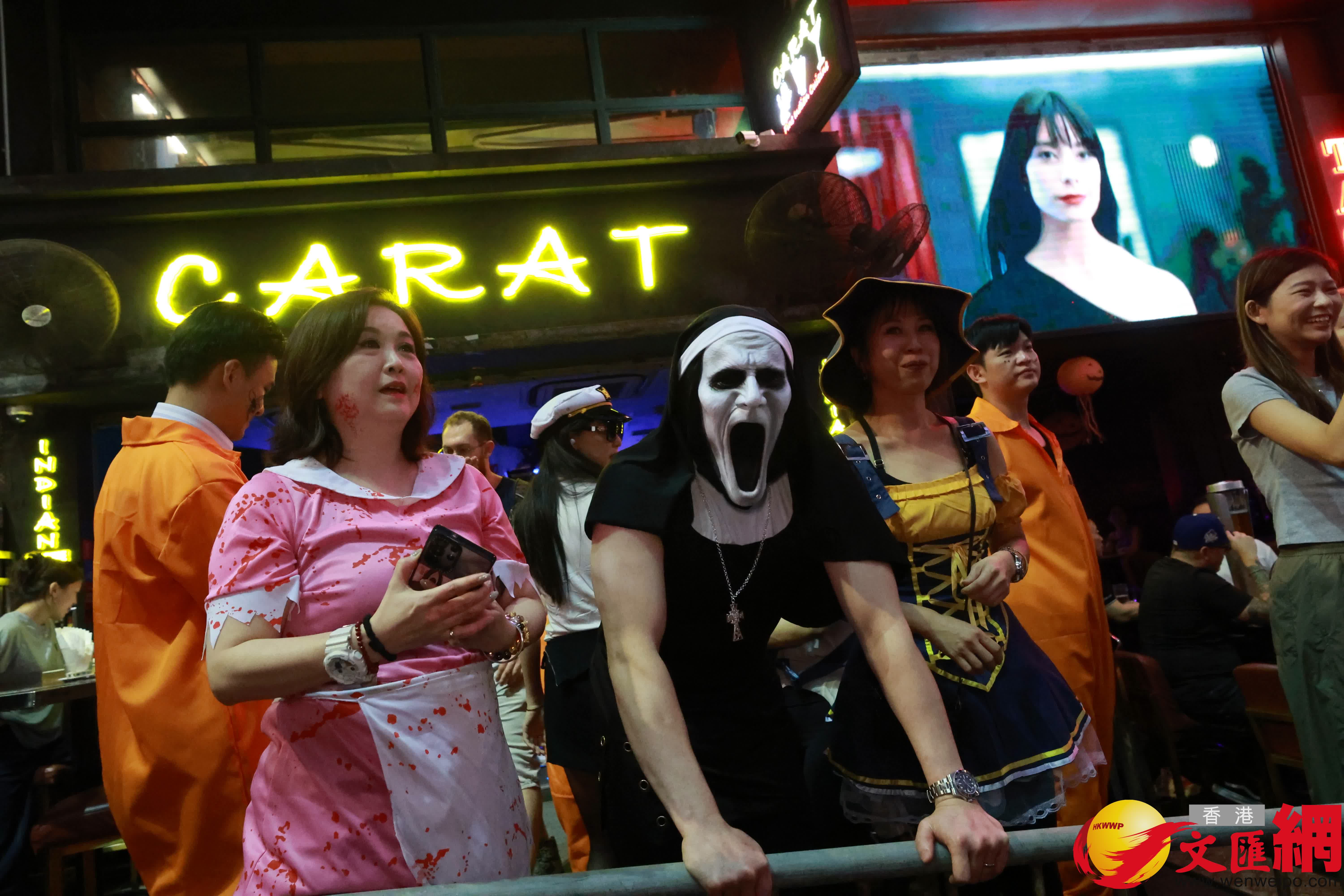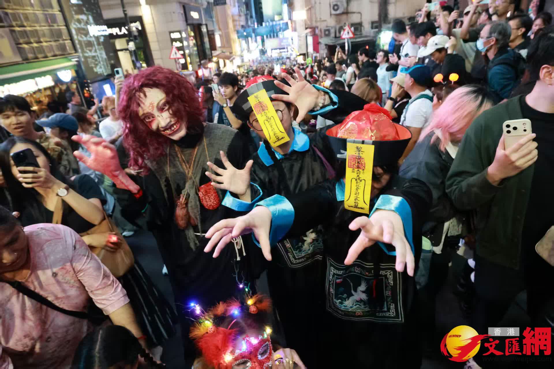 今日(31日)是萬聖節,中環蘭桂坊晚上出現「百鬼夜行」,有大批市民「扮鬼扮馬」。(香港文匯報記者 北山彥攝)
