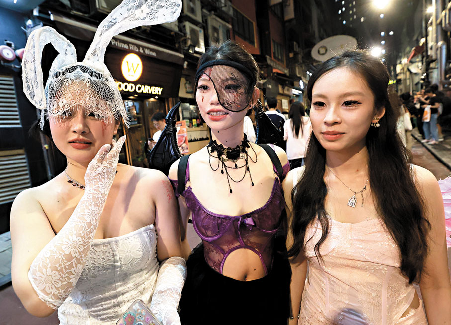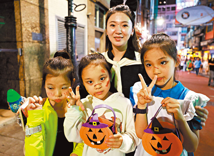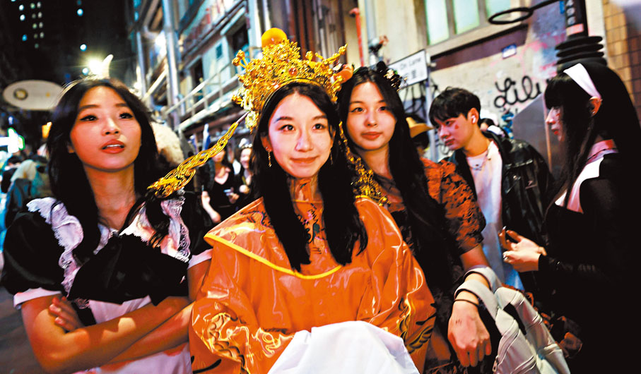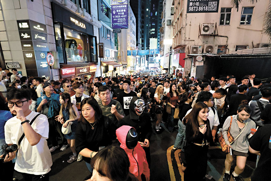 香港昨日有大批市民及旅客在萬聖節以各種鬼怪和動漫角色等造型,到中環蘭桂坊慶祝,昨晚7時左右蘭桂坊一帶已人頭湧湧,更儼如一個cosplay(角色扮演)聚會,帶動當地酒吧食肆的生意,其中有不少內地旅客專程來港參與這場盛宴,有來自深圳的旅客扮演成財神爺,深受他人歡迎,該旅客表示相較內地,香港節日的慶祝氣氛熱閙,參與人數亦更多。蘭桂坊協會總監張素媚表示,今年萬聖節氣氛熱烈,萬聖節餐單上月推出,預訂就已爆滿,估計蘭桂坊昨晚整體生意額較去年有四成增長。 ●文:香港文匯報記者 張弦 圖:香港文匯報記者 北山彥