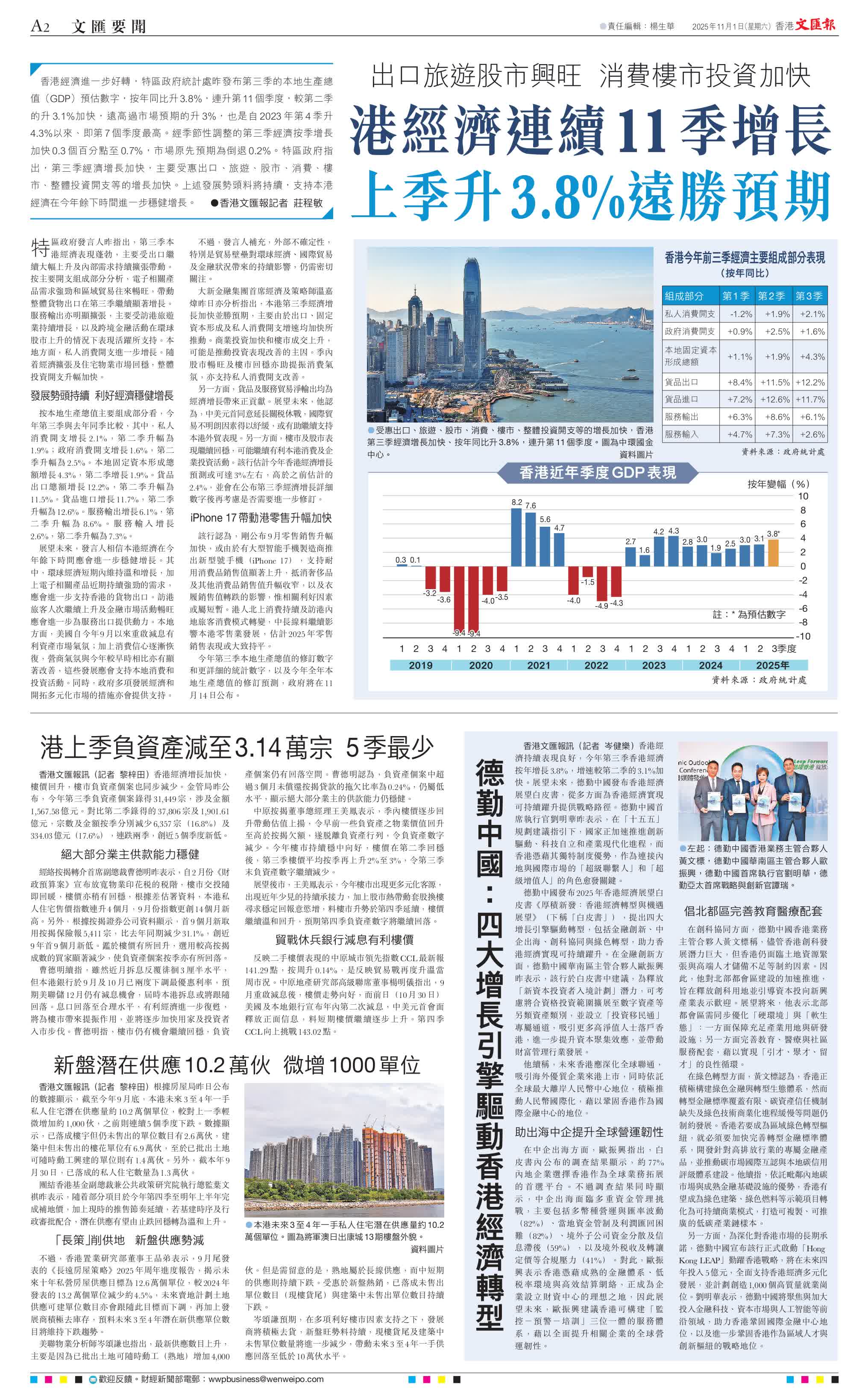 香港文匯報訊(記者 莊程敏)香港經濟進一步好轉,特區政府統計處昨發布第三季的本地生產總值(GDP)預估數字,按年同比升3.8%,連升第11個季度,較第二季的升3.1%加快,遠高過市場預期的升3%,也是自2023年第4季升4.3%以來、即第7個季度最高。經季節性調整的第三季經濟按季增長加快0.3個百分點至0.7%,市場原先預期為倒退0.2%。特區政府指出,第三季經濟增長加快,主要受惠出口、旅遊、股市、消費、樓市、整體投資開支等的增長加快。上述發展勢頭料將持續,支持本港經濟在今年餘下時間進一步穩健增長。