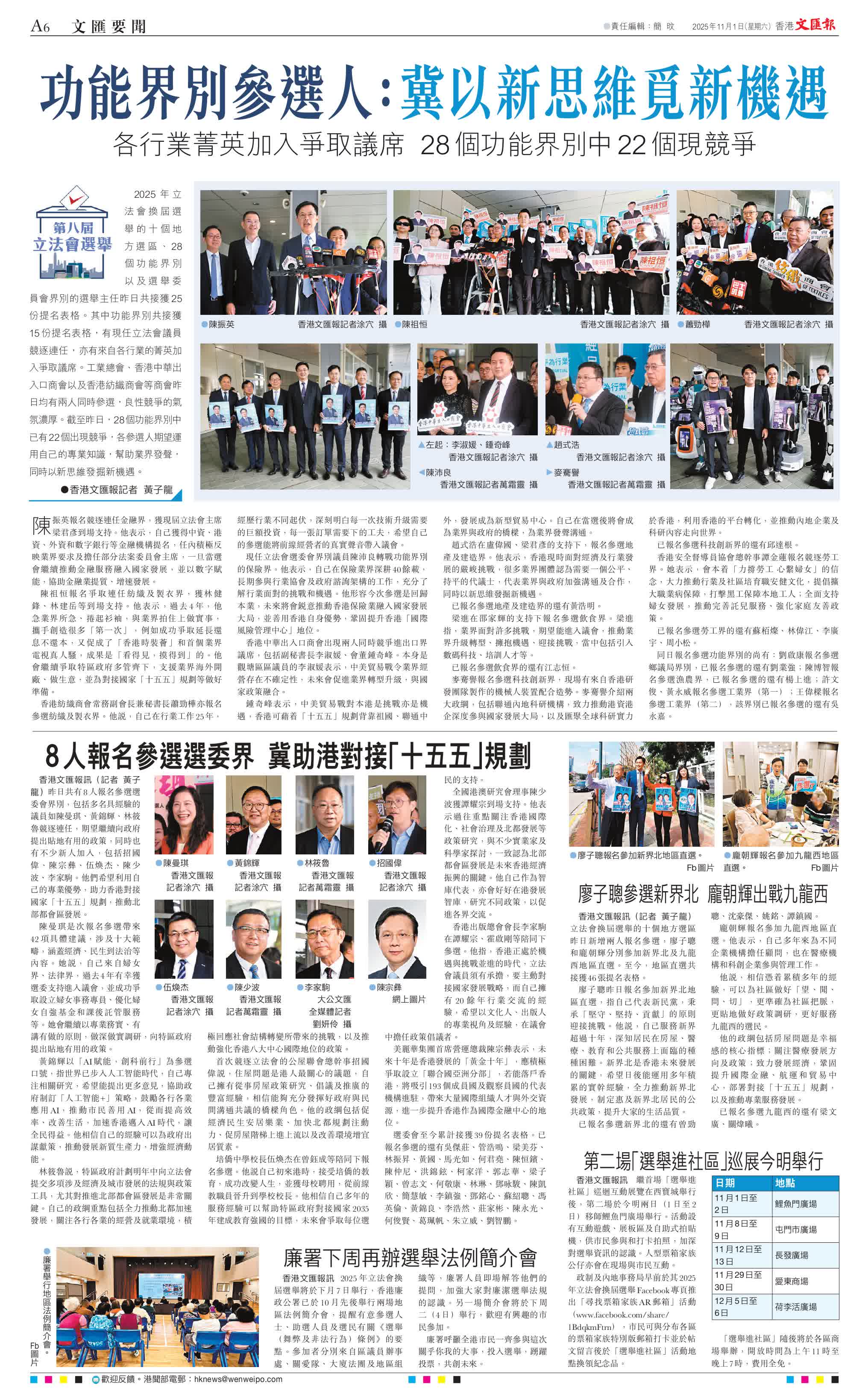 香港文匯報訊(記者 黃子龍)2025年立法會換屆選舉的十個地方選區、28個功能界別以及選舉委員會界別的選舉主任昨日共接獲25份提名表格。其中功能界別共接獲15份提名表格,有現任立法會議員競逐連任,亦有來自各行業的菁英加入爭取議席。工業總會、香港中華出入口商會以及香港紡織商會等商會昨日均有兩人同時參選,良性競爭的氣氛濃厚。截至昨日,28個功能界別中已有22個出現競爭,各參選人期望運用自己的專業知識,幫助業界發聲,同時以新思維發掘新機遇。